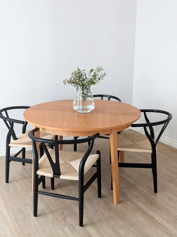 La silla wishbone está realizada a partir de madera haya y tejido de hilo de papel kraft.