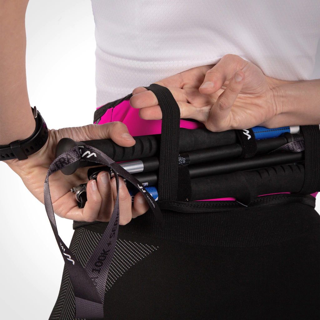 La faja portabastones SIMER BELT, de ajuste ceñido pero flexible a la vez, abraza al cuerpo sin rebotes durante la carrera. Además es ultraligera, con acceso rápido y fácil a cualquier elemento esencial que se necesite gracias a las múltiples opciones de almacenamiento: un bolsillo con cierre, 4 espacios de guardado expandibles (trasero, delantero y laterales) y dos elásticos portabastones diseñados para llevar los bastones plegados en la cintura en los momentos en los que se necesita tener los brazos libres y descansados.