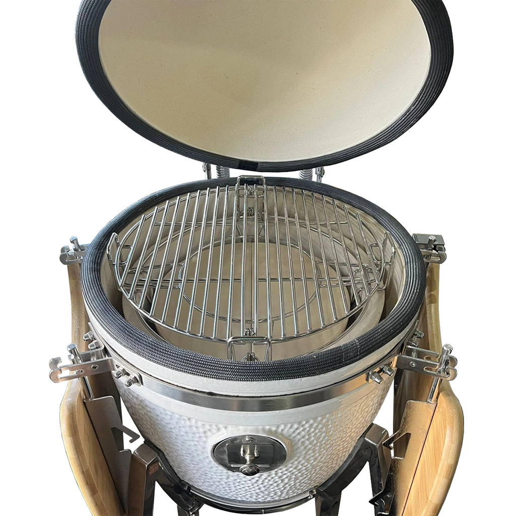 Este sistema de coccion presenta dos niveles de parrilla que brindan la posibilidad de utilizarlos en diferentes posiciones. La piedra colocada en el centro esta constituida por dos partes desmontables que funcionan como difusor de calor generando una coccion indirecta.