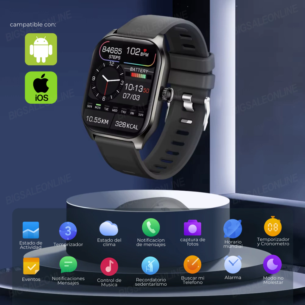 ¡¡¡ TENEMOS STOCK DE ESTE PRODUCTO !!Tu mejor Elección a la hora de comprar un Excelente SmartWatch!!Reloj Inteligente SmartwatchNT07, Novedosa Función Atiende y Realiza Llamadas ! y Microfono para hablar con iA.- Compatibles con Sistemas: Android, iOS* Este Reloj inteligente cuenta con una pantalla táctil, que admite toques en cada parte, por lo que es de fácil uso al momento de leer, operar y acceder al menú.* FUNCIONES:MUSICA .!* Mantén controlado la reproducción de música desde el Smartwatch, sin necesidad de sacar tu celular, permitiendo; Pausar - Siguiente Canción - Anterior Canción - Play. (para poder usar este modo el SmartWatch deberá estar conectado a tu celular.MODO EJERCICIOS !* Seleccionando esta opción en tu Reloj te brindara diferentes modos de ejercicios como:- Saltar Cuerda- Correr- Ciclismo- Montañismo y muchisimos mas...!* Al seleccionar cualquier de estos modos podrás a su misma vez podras tomar diferentes datos como pasos, tiempo, calorías, distancia recorrida, presión cardiaca, y otros datos mas, dependiendo del modo de actividad que elija.CAMARA !* Selecciona Esta opción que te brinda desde el smartwatch y activaras las cámara de tu celular, permitiendo así, capturar las fotos que desees presionando la pantalla de este reloj.CAMBIA EL MODO DE PANTALLA* Desliza desde la pantalla principal los diferentes modos de pantalla, y elige el que mas te guste* Manipula este grandioso reloj de Derecha a Izquierda, de Arriba y Abajo y encontraras un menú distinto en cada sección en donde podrás acceder al menú de este* Cuenta además con Las principales Funciones de un buen SmartWatch como CRONOMETRO, CALCULADORA, PODOMETRO, MEDIDOR DE DISTANCIA, MEDIDOR DE SUEÑO, FRECUENCIA CARDIACA, MENSAJES, LLAMADAS, CLIMA Y MUCHO MAS...* Importante resaltar que descargando la aplicación con la que este trabaja llamada " DAFIT", podrás obtener todo los datos que mide el reloj reflejado en la app y asi poder controlar mucho mas, como:- Control de música- Capturadora de fotos.- Notificaciones de llamada- Notificación de WhatsApp, Facebook, Twitter, Instagram, y mucho mas...* Este grandioso reloj cuenta con una amplia variedad de opciones para darle a tu dia a dia un monitoreo completo.* ESPECIFICACIÓN TECNICAS- Material de la caja: Aleacion de aluminio- Conectividad inalámbrica: Bluetooth a través de su Aplicación. Version 4.0- Compatibles con Sistemas: Android 4.2 / iOS 8.0 y superior- Nombre de la aplicación: " DAFIT" (Google Play o APP Store)- Idioma del Reloj: Spañol- Idioma de la aplicación: Español/Ingles/Frances/Italiano/Portugues y otros* BATERÍA:- Capacidad de la batería: 210 mAh- Tiempo de carga: aproximadamente 2 horas (primera carga al comprar es de 4 horas)- Tipo de carga: Cable magnético ( incluido )* RELOJ- Material del Cuerpo: Aleación de Aluminio- Ancho: 30 mm- Alto: 43 mm- Grosor del cuerpo: 10 mm- Largo Total del reloj de punta a punta : 260 mm- Malla totalmente remplazable de strap* CONTENIDO DEL PAQUETE1 x SmartWatch NT06 Negro1 x Malla puesta de silicona1 x Cable de Carga magnética1 x manual de usuarioPresentación en CajaEstamos para atender todas tus dudas.!=====================================================Somos BIGSALEONLINE. tienda Online E-Commerce=====================================================