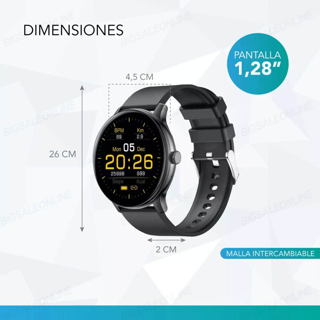 Este grandioso Smartwatch esta diseñado para tu dia a dia y asi poder tener el control de tus métricas diarias. Cuenta con una pantalla de 1.28" pulgadas y Diferente funciones para el tu dia a dia