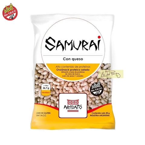 Snack Proteico Sabor Queso:Samurai es el primer Ovo-Snack tipo texturizado altamente proteico y rico en minerales.Libre de glutenIngredientes:clara de huevo, trigo sarraceno, arroz, whey protein, sorgo blanco, quínoa, queso en polvo, sal.Presentación:50 grs.