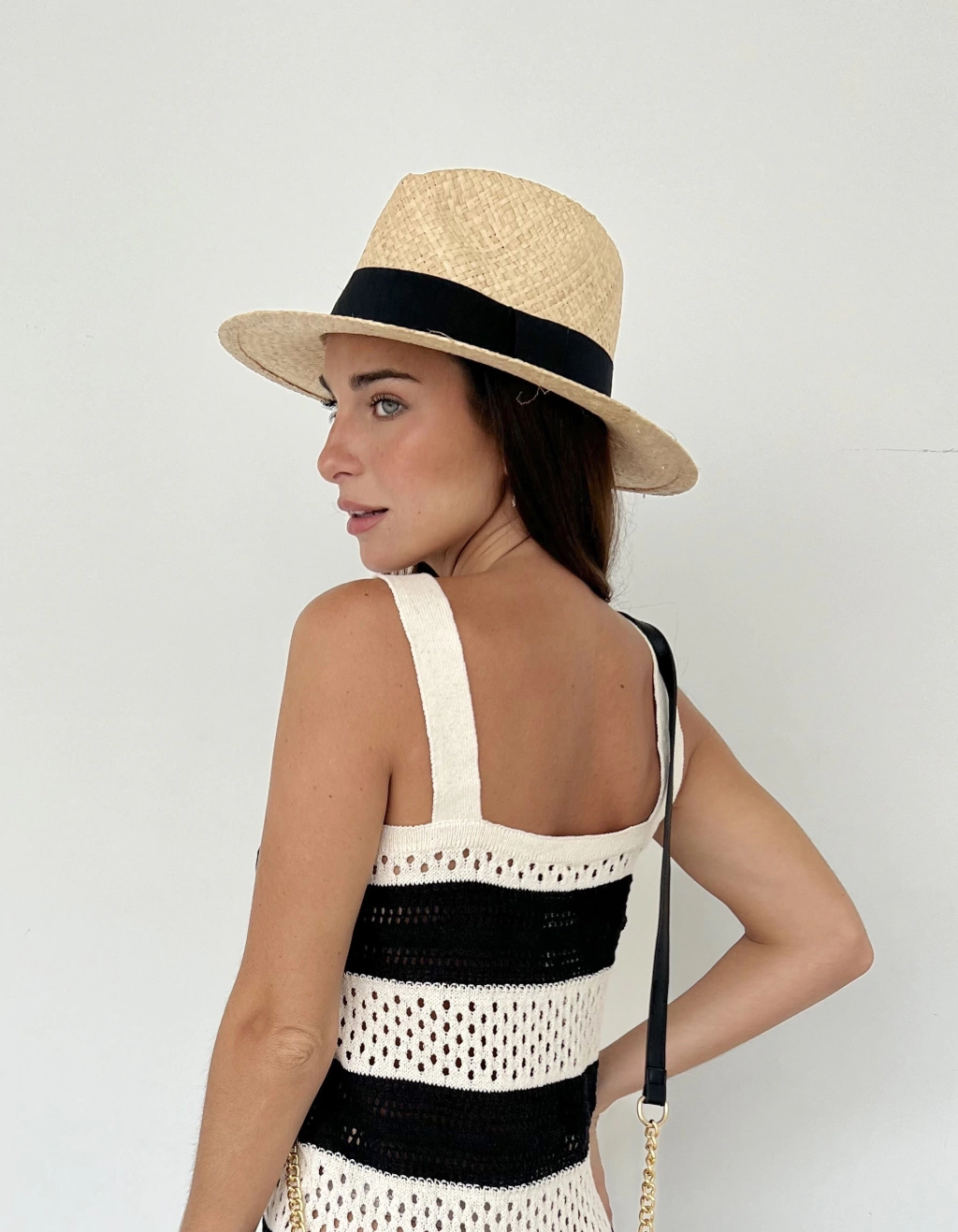 Nuestro sombrero Samira es un modelo de rafia con una cinta de gross al tono, un aliado para estar protegida del sol este verano.