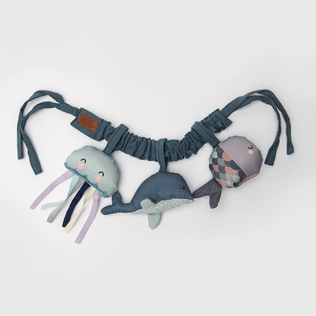 Sonajeros colgantes para el cochecito o cuna. Contiene sonido sonajero (cascabel/cajita sonajero y papel) para que tu bebé explore. Vienen presentados en una tira de elástico forrada adaptable a cualquier medida de barral de cochecito y también podés atarlo al lateral de la cuna. Es ideal para bebés que ya se sientan solitos y solitas.