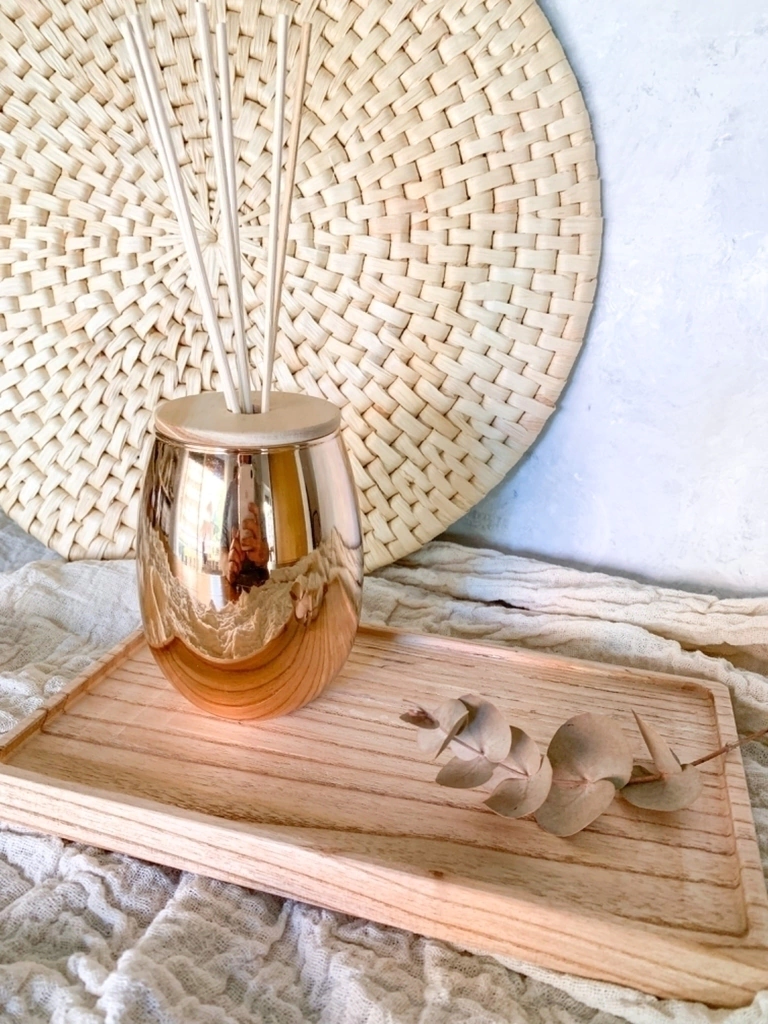 Difusor envase bombe de vidrio espejado con tapa de madera y varillas de rattan. Inluye refill de 300ml del aroma seleccionado