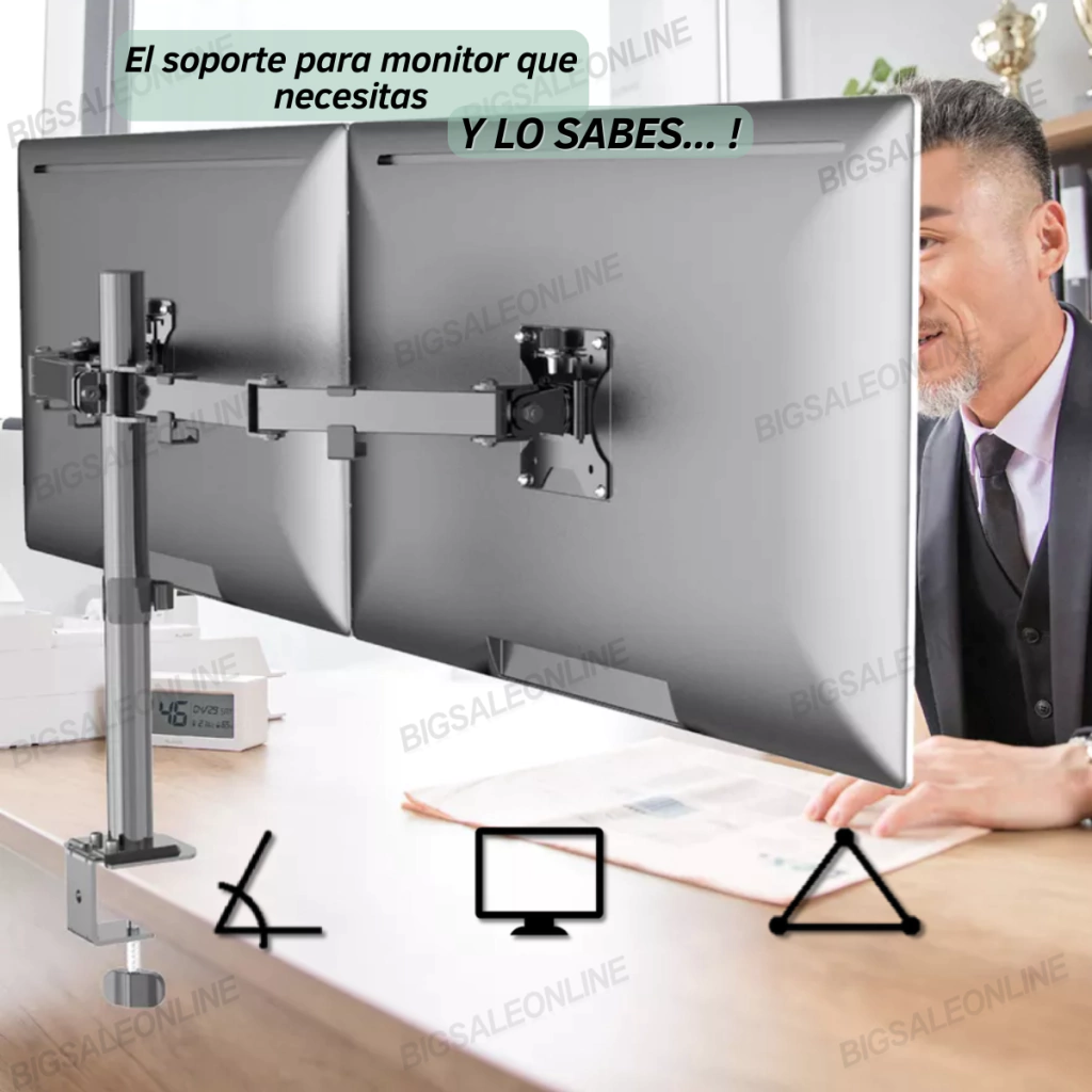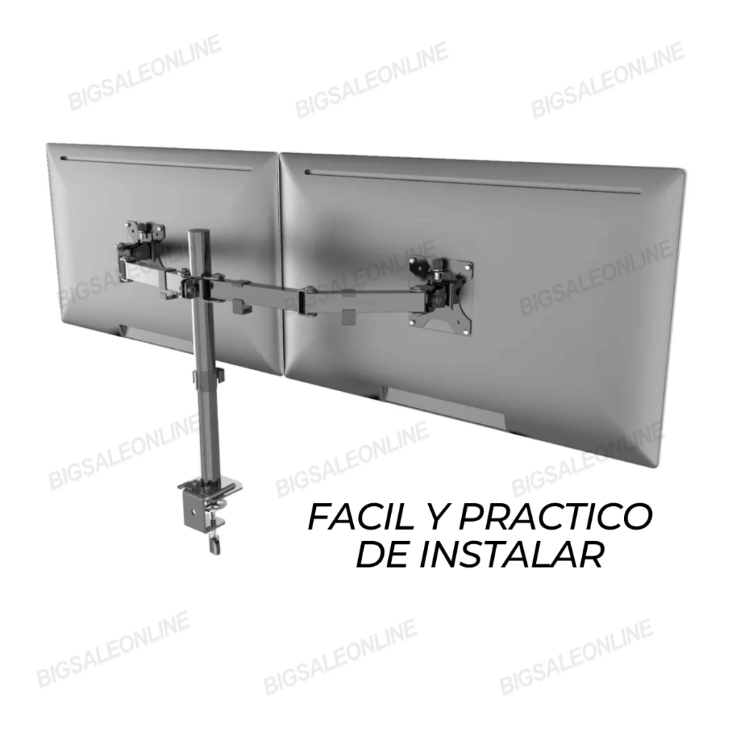 ¡¡¡ TENEMOS STOCK DE ESTE ARTICULO !!!SOPORTE PARA DOBLE MONITORES DE 20 A 30 PULGADAS SUPER RESISTENTE Y BRAZOS MOVILES Y ARTICULADOS» Este grandioso soporte no sólo te permitirá recuperar el valioso espacio en tu escritorio, sino que también promueve una postura más ergonómica en tu estación durante las horas de trabajo o de entretenimiento.» Resistente soporte, con acabado en color negro y elaborado con acero de alta calidad, ha sido diseñado para pantallas de hasta 30 pulgadas, con un peso máximo de hasta 8 kg.» Ajuste de Prensa Sólida que te garantiza máxima estabilidad sobre cualquier escritorio o superficie de trabajo. Una placa VESA desmontable simplifica la instalación, ya que permite atornillarla al monitor y luego deslizarla directamente sobre el brazo de montaje.» Es posible girar e inclinar su mecanismo de brazos resistentes totalmente articulado, con el fin de ajustar el ángulo de lectura, pudiendo además cambiar de horizontal a vertical la orientación de la pantalla sin necesidad de desmontarla.CARACTERISTICAS* Dobles brazos para monitores con ajuste de Prensa en Escritorios, Mesas, Etc...* Apto para dos pantallas de hasta 30 pulgadas y 8 kg de peso en cada brazo* Elaborado con materiales de primera calidad* Soporte de altura ajustable, compatible con VESA 75X75 maximo de 100x100* Brazo totalmente articulado, con un ángulo de inclinación de 90º y una rotación de 360º, para una flexibilidad excepcional* Fácil de armar y de instalar en cualquier mesa o escritorio* Incluye completo kit de herrajes* Diseño funcional y versátil de excelente Calidad !!!Estamos para atender todas tus dudas.!=====================================================Somos BIGSALEONLINE. tienda Online E-Commerce=====================================================