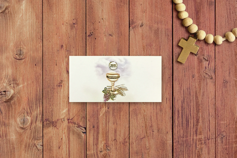 Souvenir de Comunión Modelo ST 1237/3Pack x 25 unidadesFormato: 2.5 x 5 cm cerradoPapel Ilustracion 250gImpresion Color + Stamping Oro MetalizadoDetalles en Relieve*El precio incluye personalización de texto.