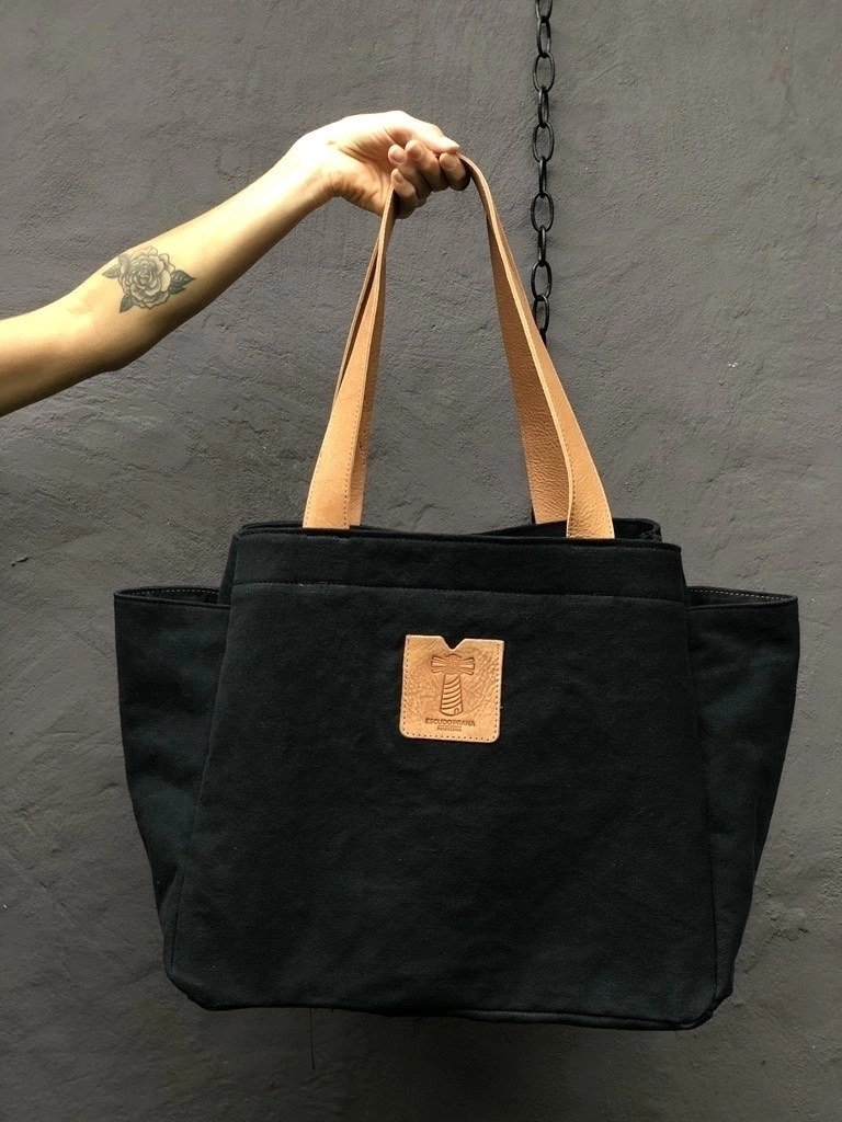 Cartera de Canvas de algodón negro con detalles en cuero vegetal Camel
