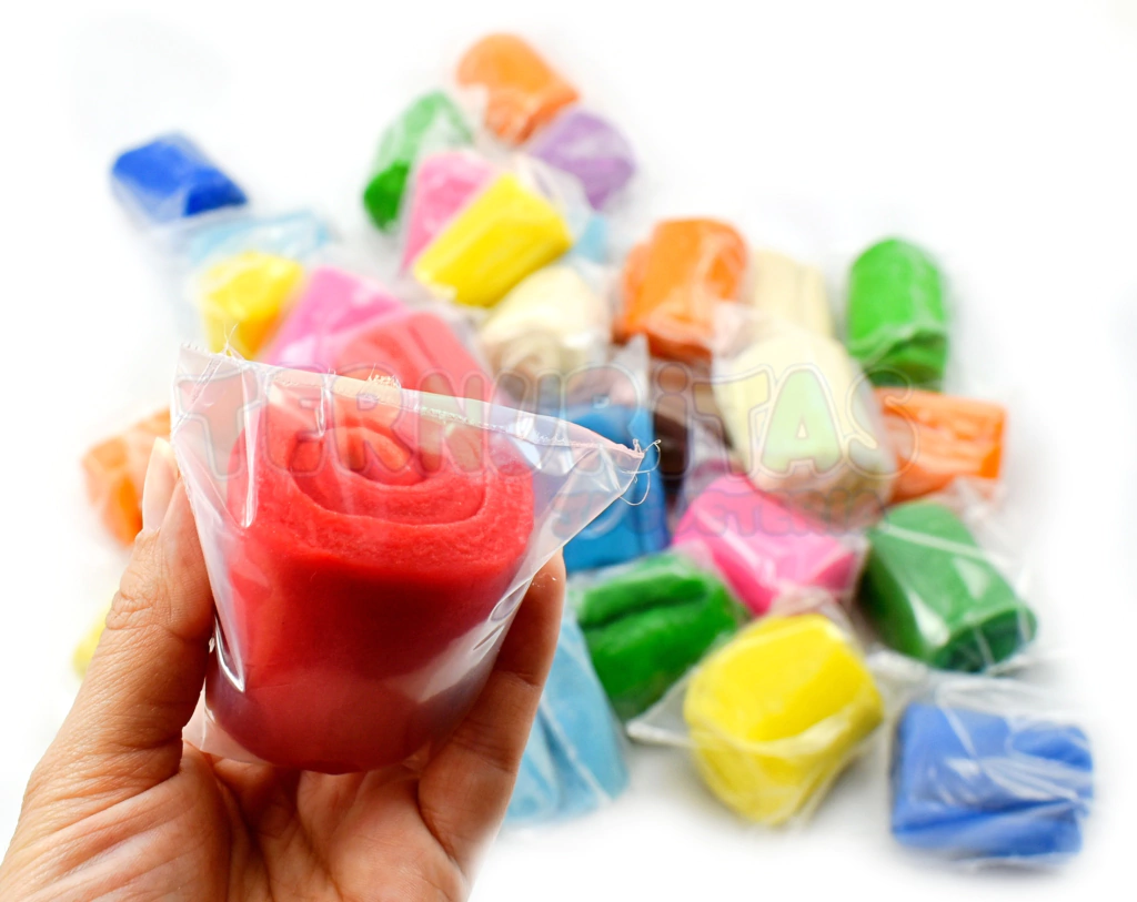Nuestra masa NO MANCHA. Soporta 24 Hs sin envoltorio, entonces no se seca durante el juego. No es pegajosa. Nuestros colores son brillantes e intensos (las fotos son reales). Tiene un increíble aroma Tutti Frutti (chicle). Los componentes son 100% comestibles, lo que asegura su NO TOXICIDAD.