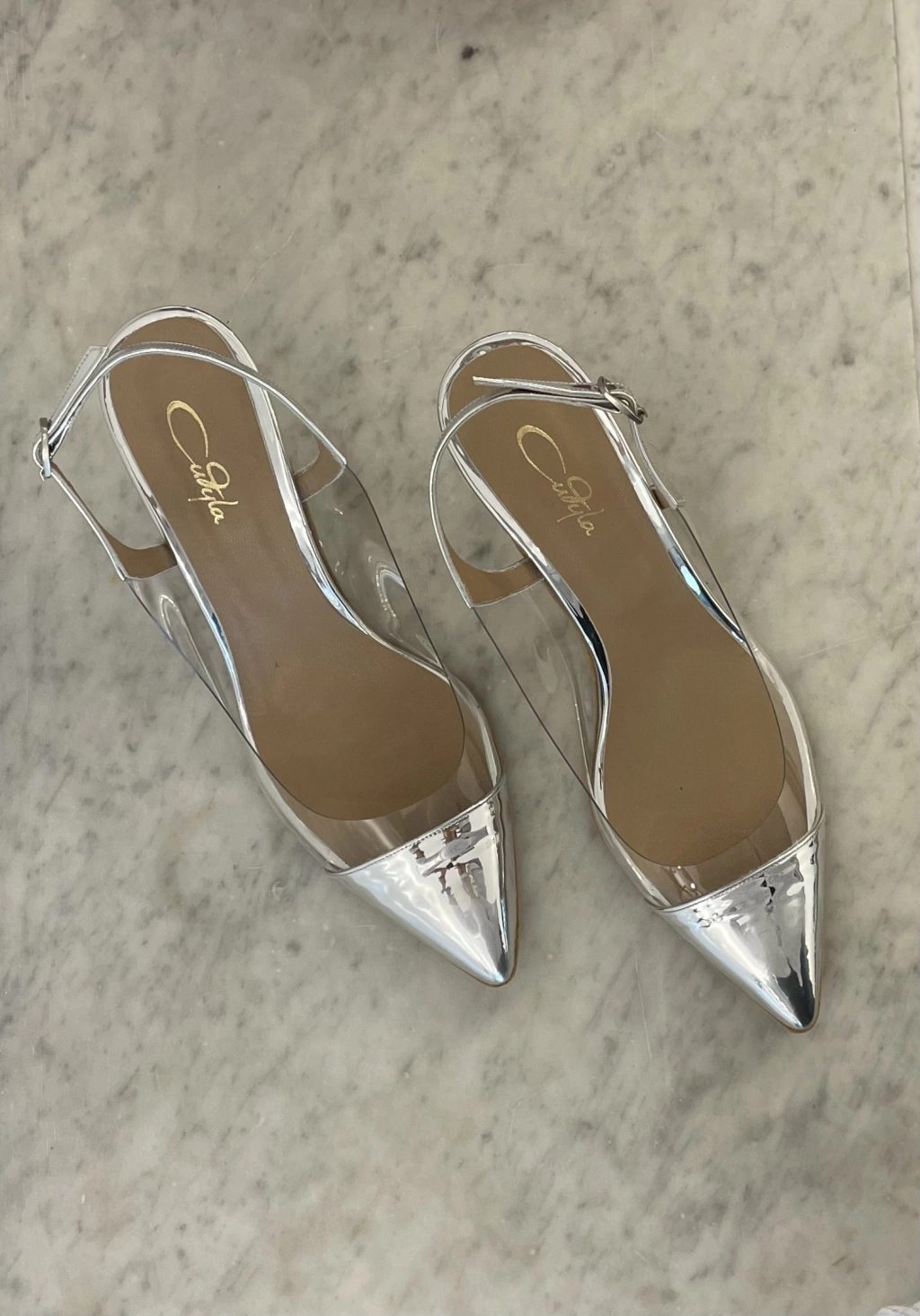 Stilleto acrílico , transparente con puntera talonera espejo plata