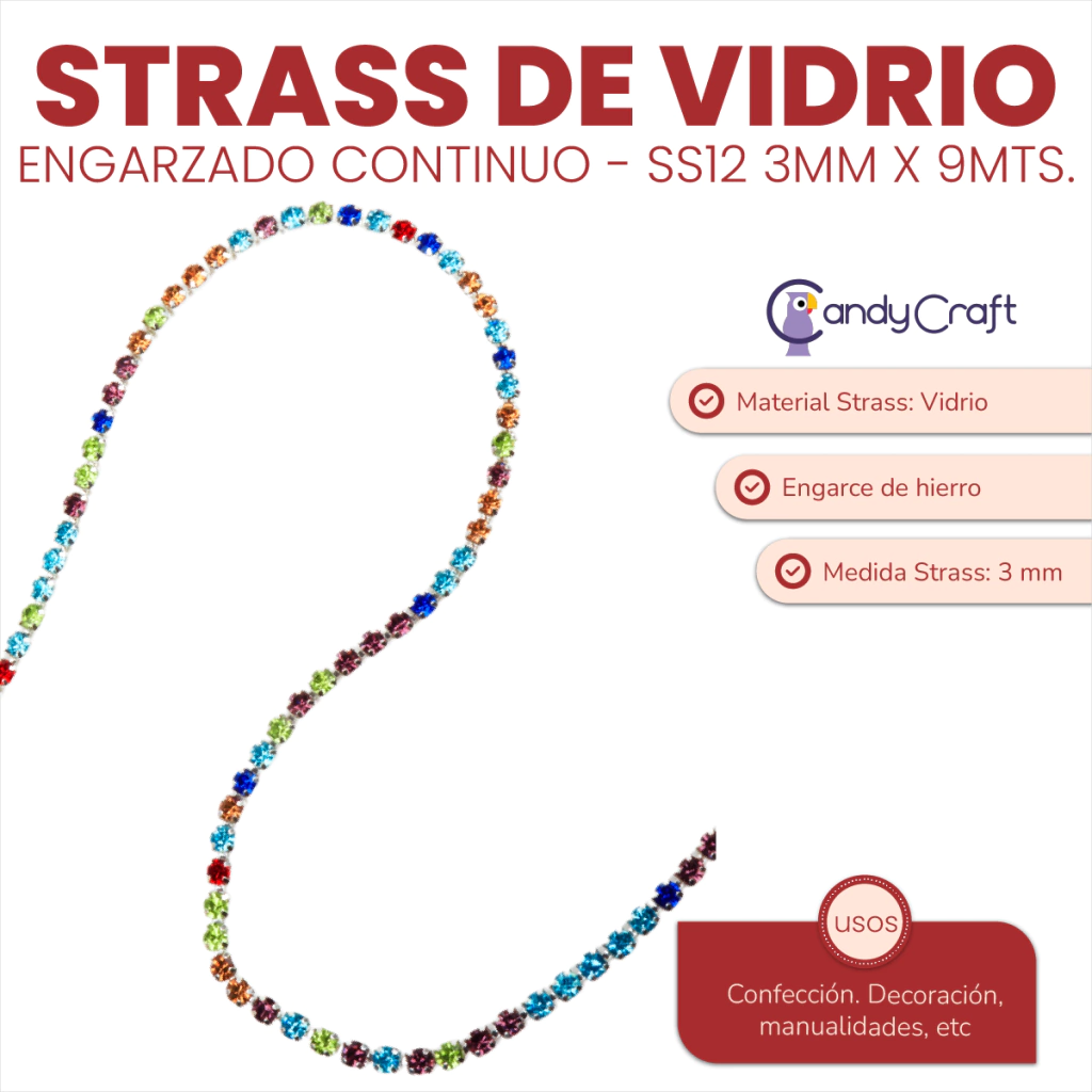 Strass de Vidrio Engarzado Continuo SS12 3mm X 9 Metros Medida del strass: 3mm SS11. Largo del rollo: 9 metros. Material: strass de vidrio y engarce de hierro. Usos: Decoración, Confección, etc.
