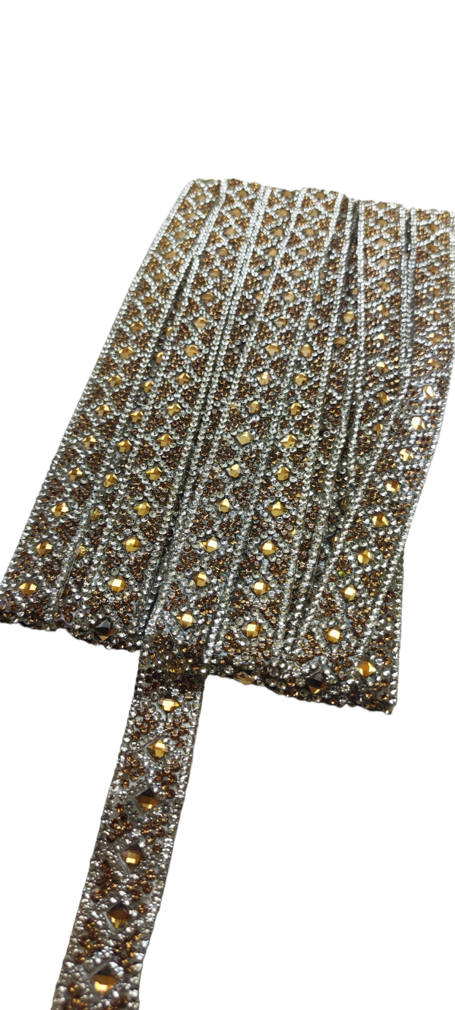 Tira de strass termotransferible .Piedra de vidrio cristal y dorada.Largo 4.5 mts .Ancho 1,5 cm.