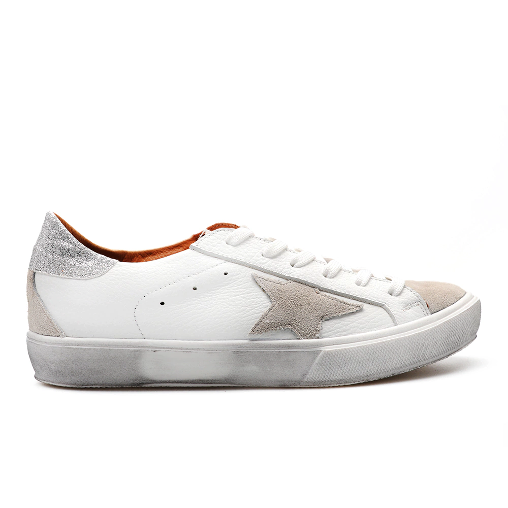 STAR:Es una zapatilla que se destaca por su base que lleva un tratamiento artesnal para darle ese efecto "vintage" como gastado. Esta confeccionada en cuero vacuno floter blanco, con detalles en gamuza y glitter. Forrada en cuero. Tiene plantillas acolchadas y extraíbles para mayor confort.Suela:GomaForro:CueroHorma:Estándar. Calza el número.*Precio online**Las variaciones de tono e imperfecciones de la piel son inherentes a este tipo de material y hacen a la autenticidad y unicidad del producto