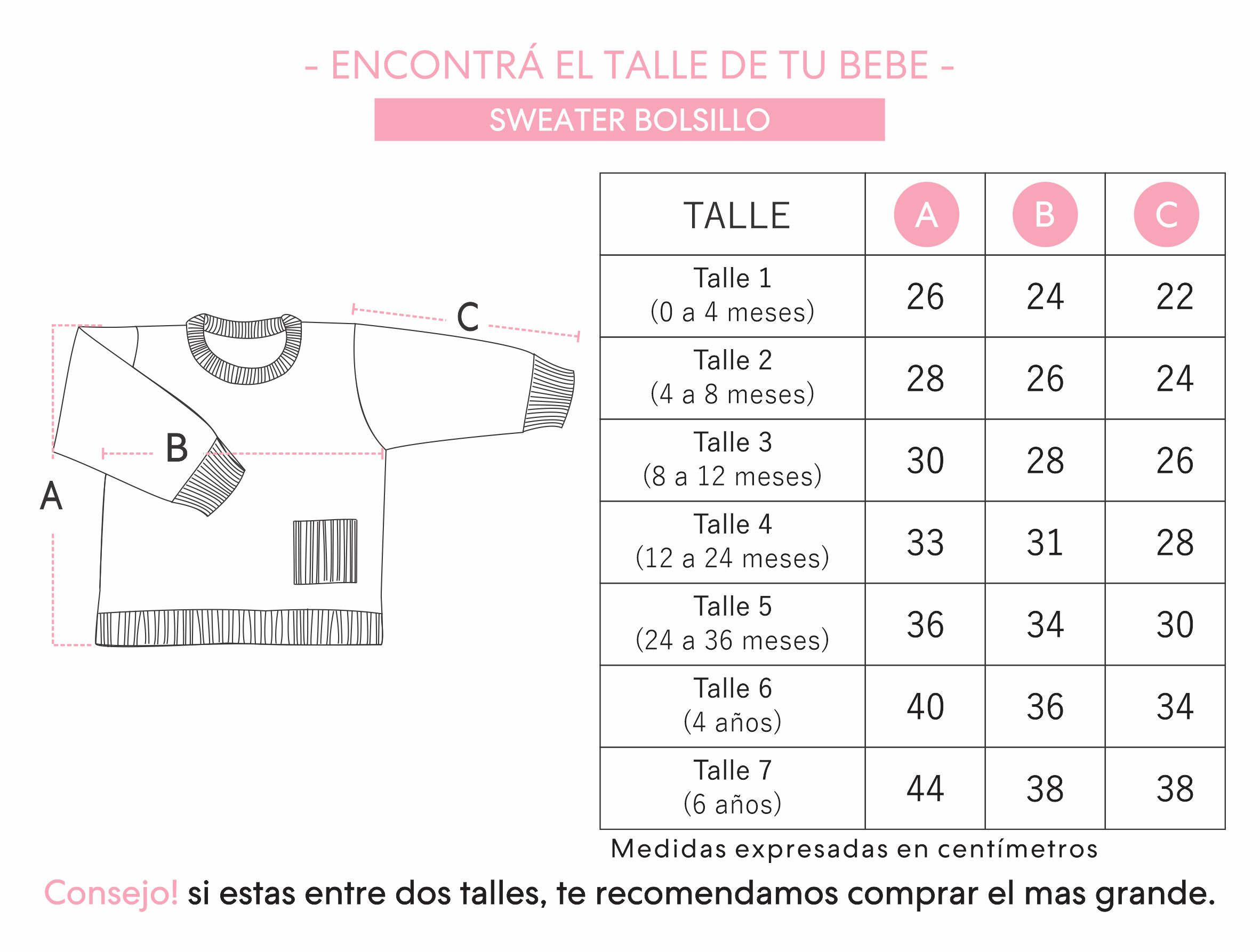 Guía de talles: Podés utilizarla para comparar con las medidas de alguna prenda de tu bebé. Al tratarse de prendas con procesos manuales puede haber una mínima diferencia entre el producto y la tabla.