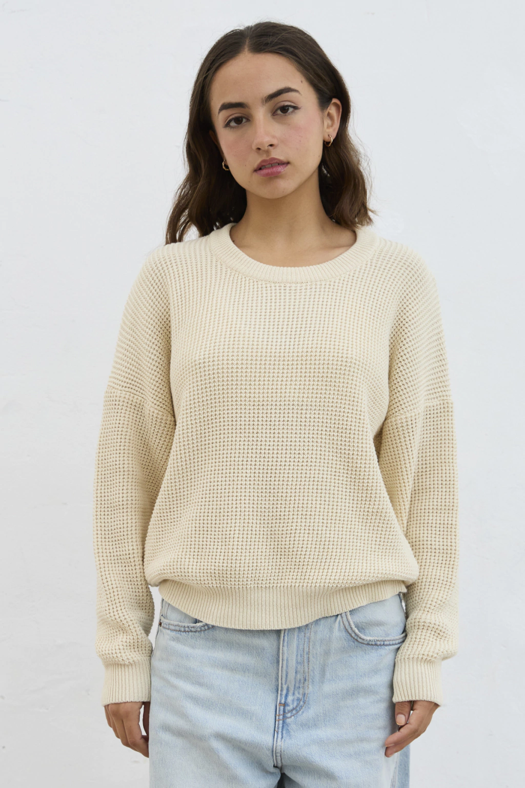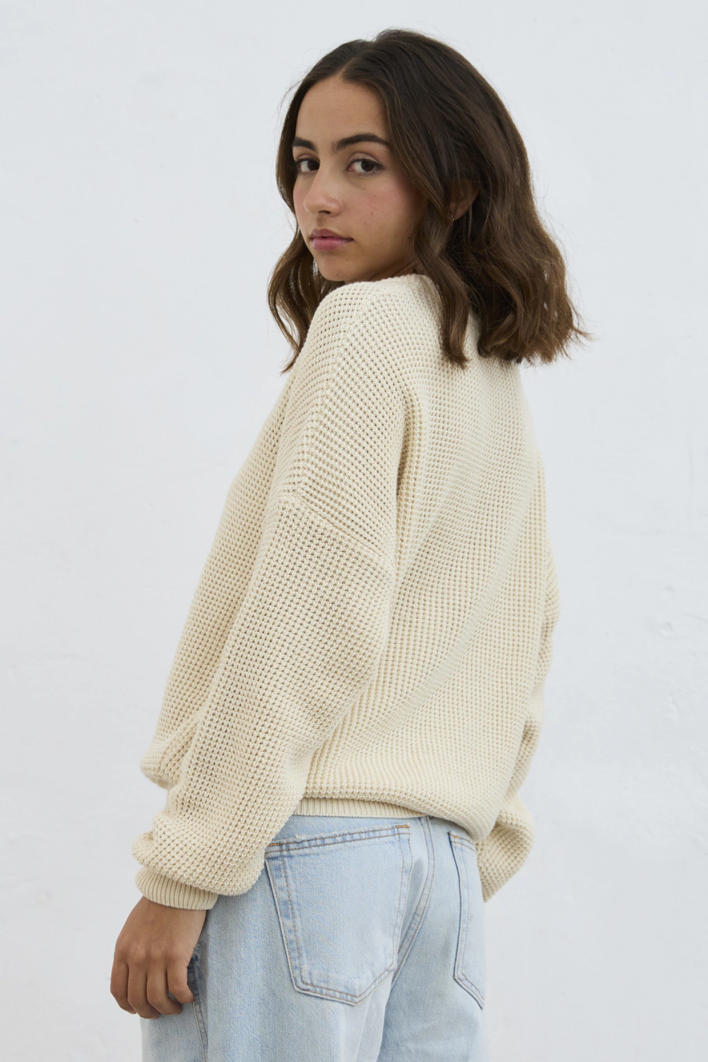 Sweater punto panal de abeja en 100% algodón. Tiene puños en manga y ajusta con puño también en cintura. Amplio y corto. Es tu bucito para el verano. Hace conjunto con el short Miel.