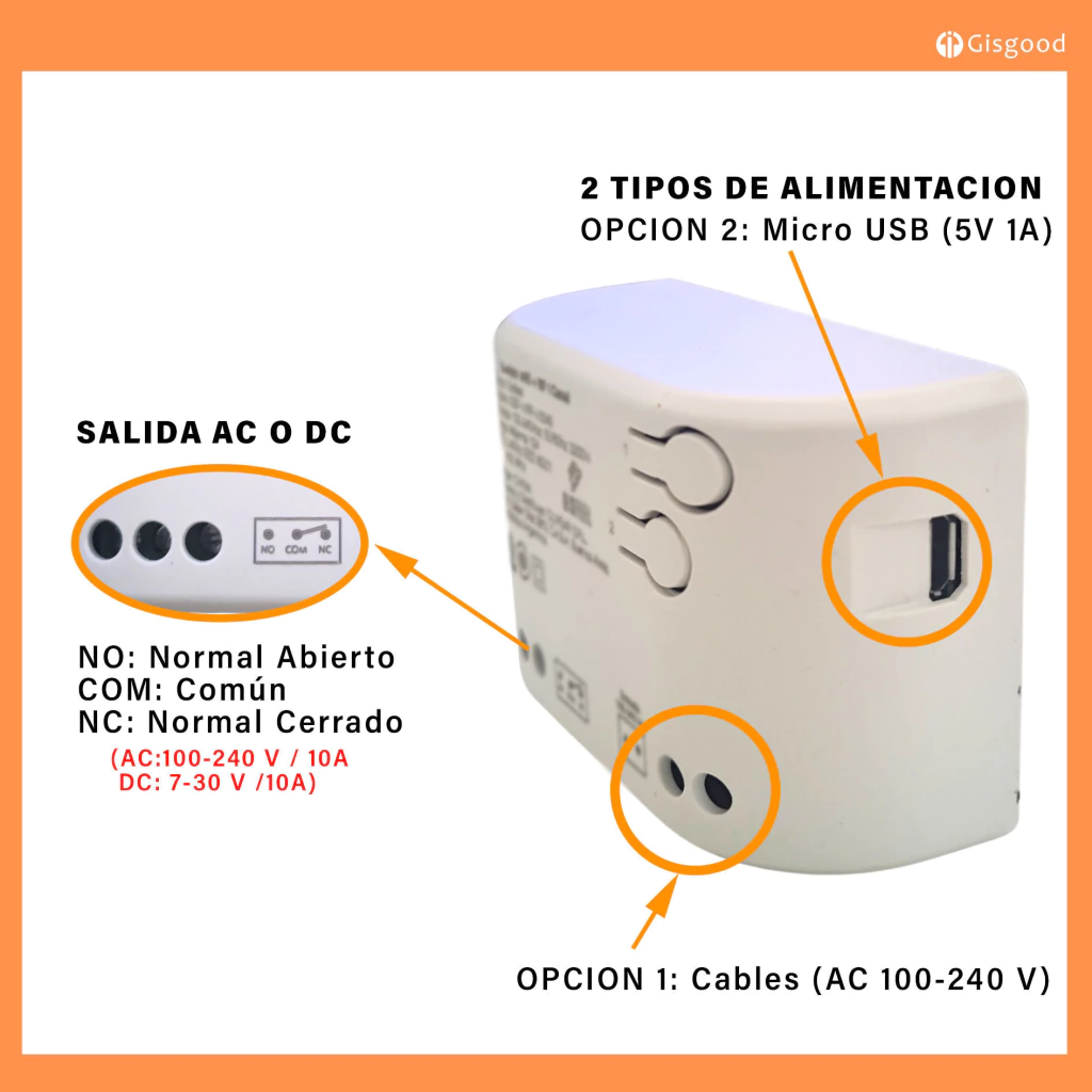 • El Switch Smart Wifi + RF permite ser energizado mediante cable usb (Micro USB 5v 1a) o AC 100-240V. De manera independiente (a la alimentación) la salida permite manejar tensiones AC 100-240V o DC 7-32V. Permite controlar dispositivos que necesiten de contacto seco.