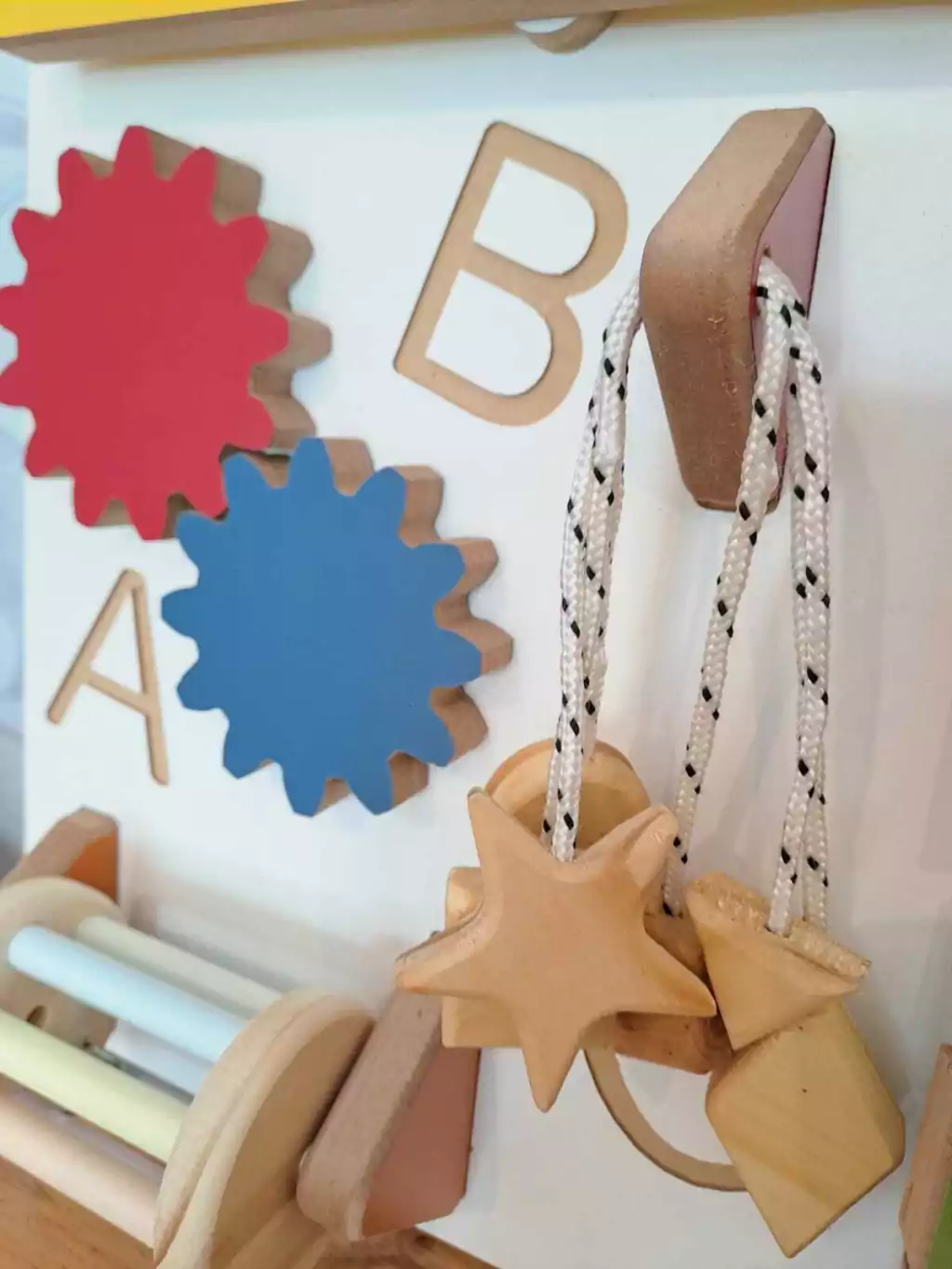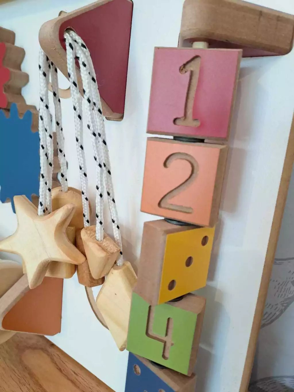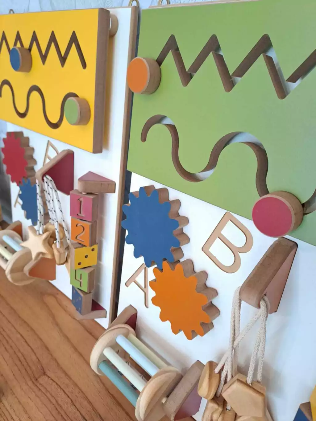 Tablero didáctico sensorial pensado especialmnete para promover el desarrollo cognitivo de los más peques. Con una variedad de actividades que le permiten estimular distintos aspectos de su desarrollo como la motricidad fina, el pensamiento lógico, el lenguaje y la escucha, el entendimiento causa y efecto, el movimiento, la imaginación y la cratividad. Un juguete evolutivo para muchísimos años de uso!Realizado 100% en madera. Lo que te asegura una durabilidad más que confiable en cada una de sus actividades.Viene listo para colgar y descolgar, dependiendo la edad de uso.Medidas: 50 cm x 35 cm.Edad sugerida: + 6 meses.Los colores pueden ir rotando según disponibilidad.