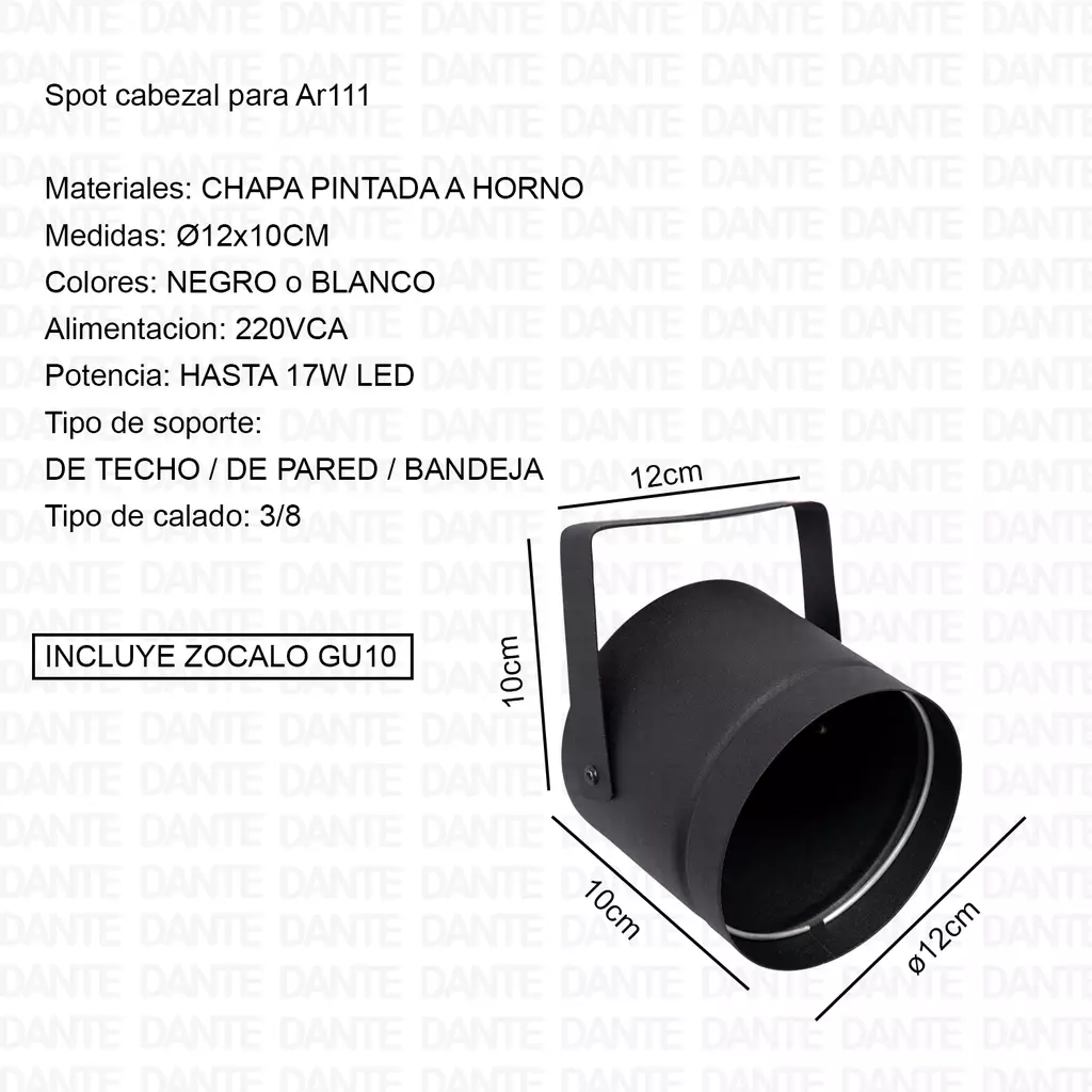 DescripciónSpot Cabezal Ar111 Tacho Teatro Proyector Bandeja Vidrieras + LAMPARA AR111Materiales: CHAPA PINTADA A HORNOMedidas: Ø12 X 10 cmColores: NEGRO / BLANCOAlimentacion: 220VCAPotencia: HASTA 12W LEDTipo de soporte: DE TECHO / DE PARED / BANDEJATipo de calado: 3/8Terminación: MICROTEXTURADOQue contiene el kit? 1 TACHO P/LAMP AR111 (CUERPO GRIS) + ZOCALO GU10 + LAMP AR111LINK SIN LAMPARA**CLICK ACA**LINK CON AR111 DIMMER CALIDA / FRIA**CLICK ACA**