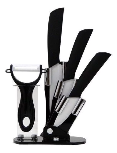 Set de 3 cuchillos de cerámica con mango de silicona: cuchillo 4" - cuchillo 5"- cuchillo 6".Pela papas de cerámica.Base de acrílico.