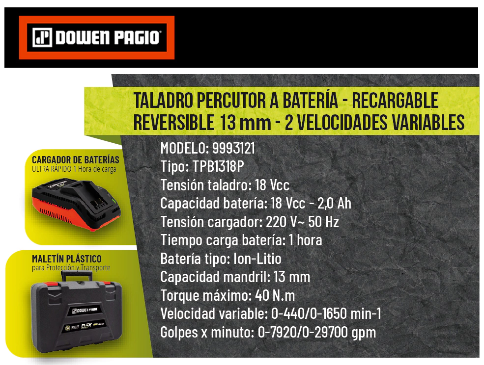 Taladro Percutor Dowen Pagio a Batería 18v 13mm 9993121Tension Taladro: 18VccCapacidad bateria: 18Vcc – 2,0 AhTension Cargador: 220V – 50HzTiempo Carga Bateria: 1 HrBateria Tipo: Ion-LitioCapacidad mandril: 13mmTorque Max: 40 NmVelocidad variable: 0 – 440/ 0 – 1650 min-1Golpes x minuto: 0 – 7920/ 0 – 29700 gpmIncluye:Maletín, cargador y batería de 2Ah.SKU: 9993121