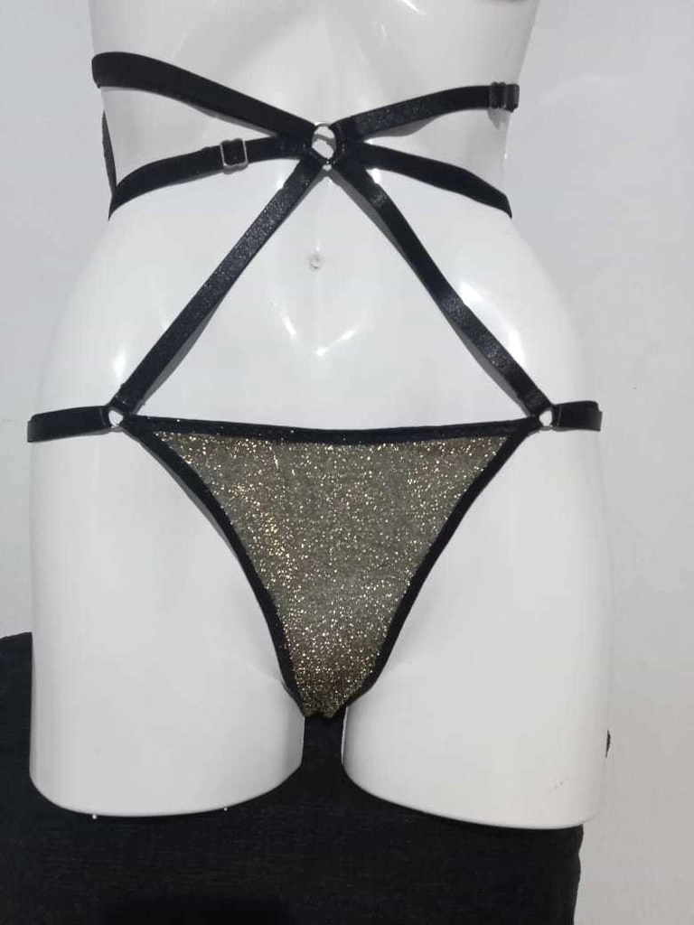 Tangas LUREXCON TIRAS REGULABLESDORADO CON BORDES Y TIRAS EN NEGROTALLE: M/XLlurez con arnéscaja5LOS PRODUCTOS SON DE USO INTIMO, POR LO TANTO, NO TIENEN CAMBIO POR HIGIENE