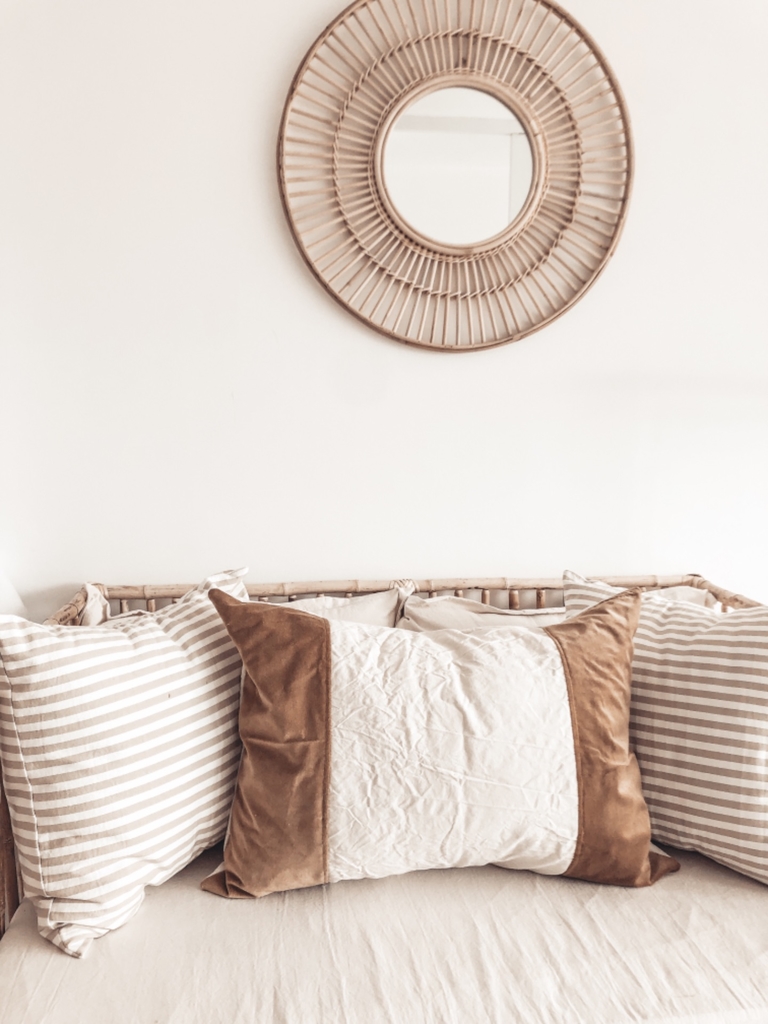 Almohadón hecho en sobre tela de algodón con apliques de pana en gris y avellana.