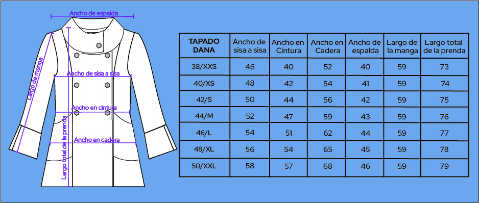 > Tabla de medidas de la prenda: En este caso, vas a poder ver las medidas que tiene la prenda en cada uno de sus talles, para que puedas compararlas con una prenda que vos ya tengas. Las medidas debes tomarlas justamente en el mismo lugar que indica el dibujo (esto es super importante) y siempre en plano sobre una mesa.