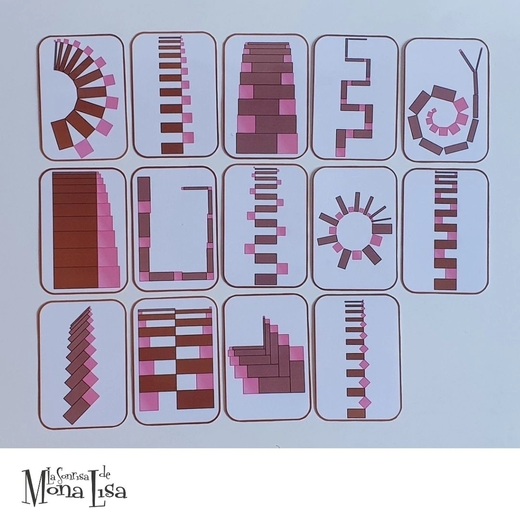 Set de 14 tarjetas plastificadas con extensiones para la Torre Rosa y Escalera Marrón MONTESSORI.