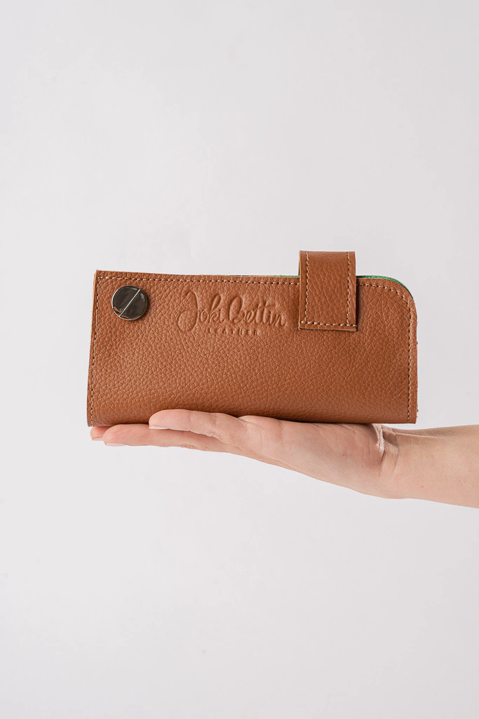 Mide 9 x 18 x 2 cm y esta elaborado en cuero flouter. Se cierra con una tapita con broche iman, y su originalidad se debe a su herraje en color niquel que une todas las pestañas.