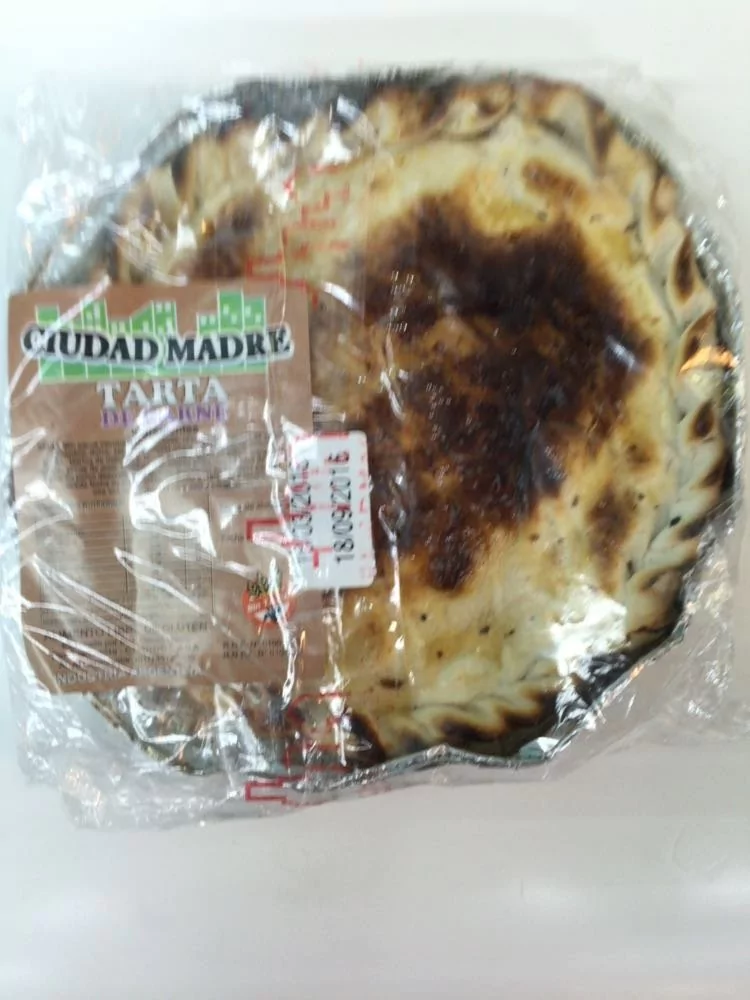 Tarta de Carne - Ciudad MadreIngredientesRelleno: Carne vacuna picada, cebolla, ajíes, pimienta, nuez moscada, cebolla de verdeo, peregil, sal, pimienta negra, ajo, cominoMasa: Harina de mandioca, fécula de maíz, leche en polvo, huevos, aceite de maíz, levadura, sal, aditivo alimentario a base de lactosa, leche en polvo descremada y lactosa