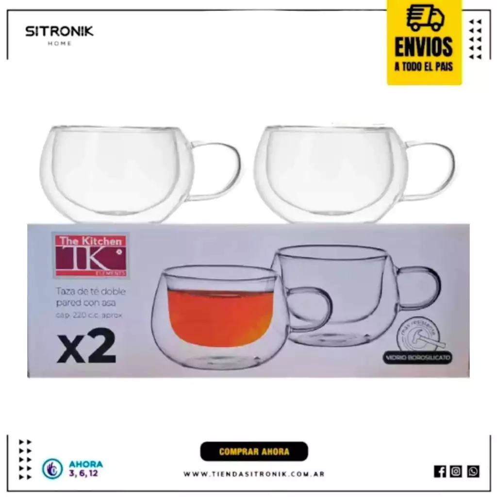 Descubre el Set de 2 Tazas de Té o Café de Doble Pared, perfectas para disfrutar de tus infusiones preferidas. Con una capacidad de 220 cc, estas elegantes tazas están hechas de vidrio borosilicato, conocido por su resistencia al calor, asegurando una experiencia placentera y segura. Su diseño de doble pared no solo es espectacular, sino que también evita que el calor o frío se transmitan al exterior, permitiéndote sostenerlas sin inconvenientes. Aunque no son aptas para lavavajillas ni microondas, su limpieza es súper fácil. Ideal para compartir momentos únicos con amigos y familiares. ¡Dale un toque de distinción a tu mesa con este set de The Kitchen!