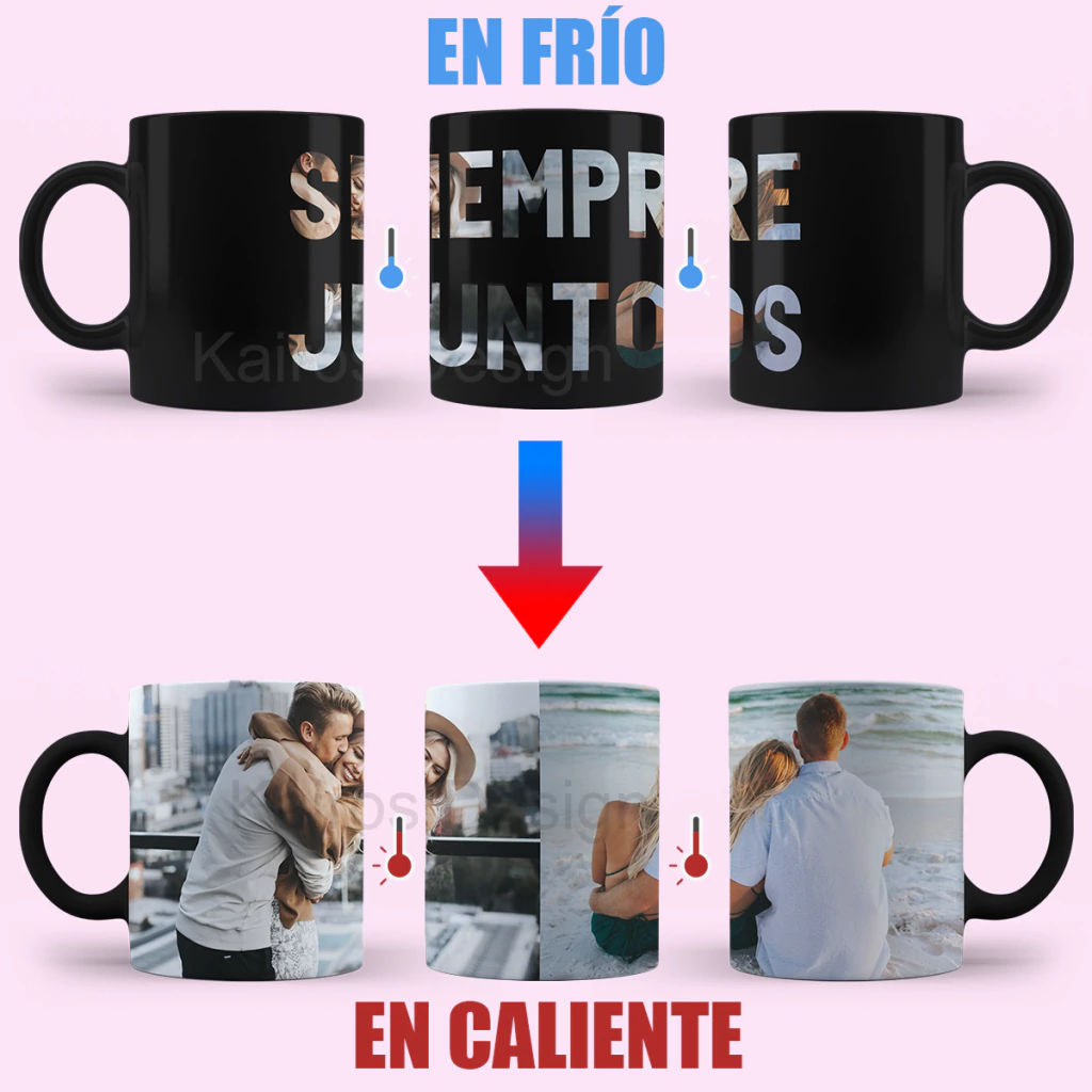 Las tazas mágicas son negras con un diseño de vinilo que se ve por encima estando fría o caliente, al ponerle líquido caliente podrás ver todo el diseño completo.