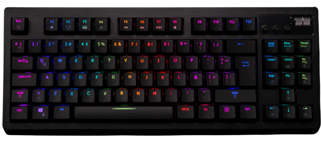 Teclado mecánico de tamaño TKL con interruptores Outemu azul, rojo o marrón. Presentación White & Black edition. Rueda de volumen metálica, controlador multimedia e iluminación completamente RGB.