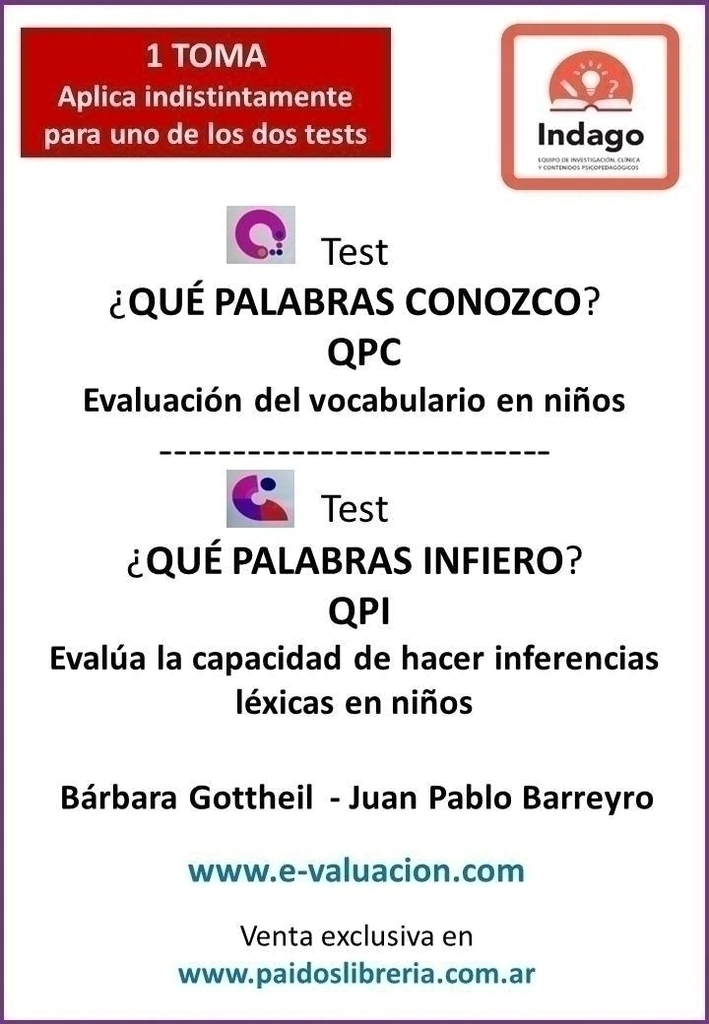 Test ¿QUÉ PALABRAS QUE CONOZCO? QPCTest ¿QUÉ PALABRAS INFIERO? QPIBarbara Gottheil - Juan Pablo BarreyroEquipo IndagoCantidad de Tomas: 1El Pago de la Toma (1) se puede aplicar indistintamente a cualquiera de los dos tests.Luego de Abonar la cantidad de Tomas seleccionadas le enviaremos un mail conla CLAVE del Cupon para ingresar las tomas al sistema y poder realizar las tomas abonadas.El mail con la Clave del cupón lo enviaremos dentro de las 24 hs siguientes (dias hábiles) o el día habil siguiente a un fin de semana o feriado.Instructivo para usuarios:Deberá ingresarwww.E-valuacioncon su nombre de usuario y clave (si nunca ingresó debera ingresar a "Registrarse" y crearlos).Una vez dentro del sistema, en la barra lateral izquierda, deberá cliquear la opción “Compras” (se abrirán más opciones) y deberá elegir “Cargar cupón”.Se abrirá una pantalla con la lista de cupones ya aplicados (si es la primera vez, no aparecerá ningún cupón anterior). Allí cliquear el botón “Agregar cupón” que se encuentra en la parte superior izquierda de la pantalla. Se abrirá una ventana dónde deberá cargar el código del cupón que ha adquirido y luego deberá cliquear el botón “Cargar Cupón”. Una vez terminado el proceso dispondrá de las nuevas tomas del producto adquiridas para su uso.La Prueba QPC (¿Qué palabras conozco?)es una prueba que tiene como propósito evaluar el conocimiento que tienen los niños acerca del vocabulario general. El vocabulario se refiere al conocimiento acerca de las palabras que maneja y conoce un niño y juega un rol crucial en el desarrollo y ejecución de una gran cantidad de habilidades cognitivas, como la lectura y la comprensión (aunque también sobre otras habilidades, como las matemáticaLa Prueba QPI (¿Qué palabras infiero?)es una prueba que evalúa la capacidad de realizar inferencias léxicas por parte de los niños. Esto es, la habilidad para interpretar adecuadamente el significado de palabras desconocidas dentro del contexto de la frase en que se presentan. La capacidad de realizar inferencias léxicas se supone una de las habilidades cruciales de la comprensión de textos y discursos.