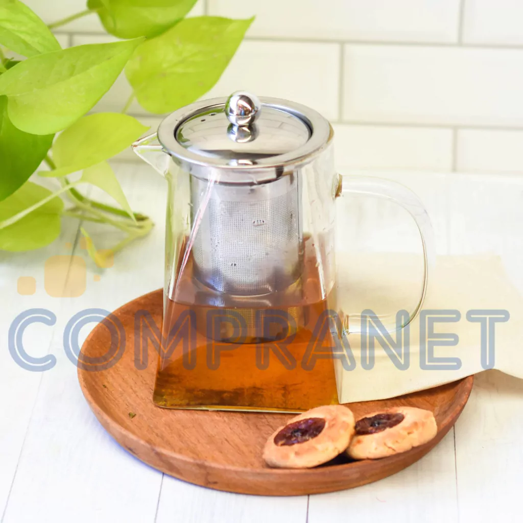 Tetera de Vidrio borosilicato, con infusor de acero inoxidable, manija lateral de vidrio y tapa de acero inoxidable.