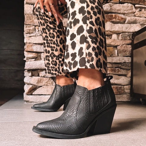 Texana en cuero reptil negro, elasticos laterales. Suela goma t taco de 8 cm.