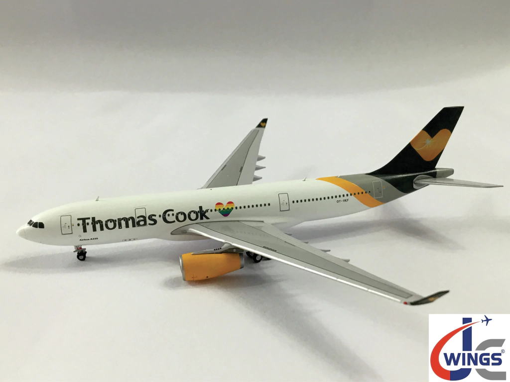Avion: Airbus A330-200Compañía: Thomas CookMatricula: OY-VKFMarca: JC WingsMaterial: Metal (Diecast)Escala: 1:400Largo de Fuselaje: 15.5 cm.Envergadura de Alas: 15 cm.Producto Exclusivo