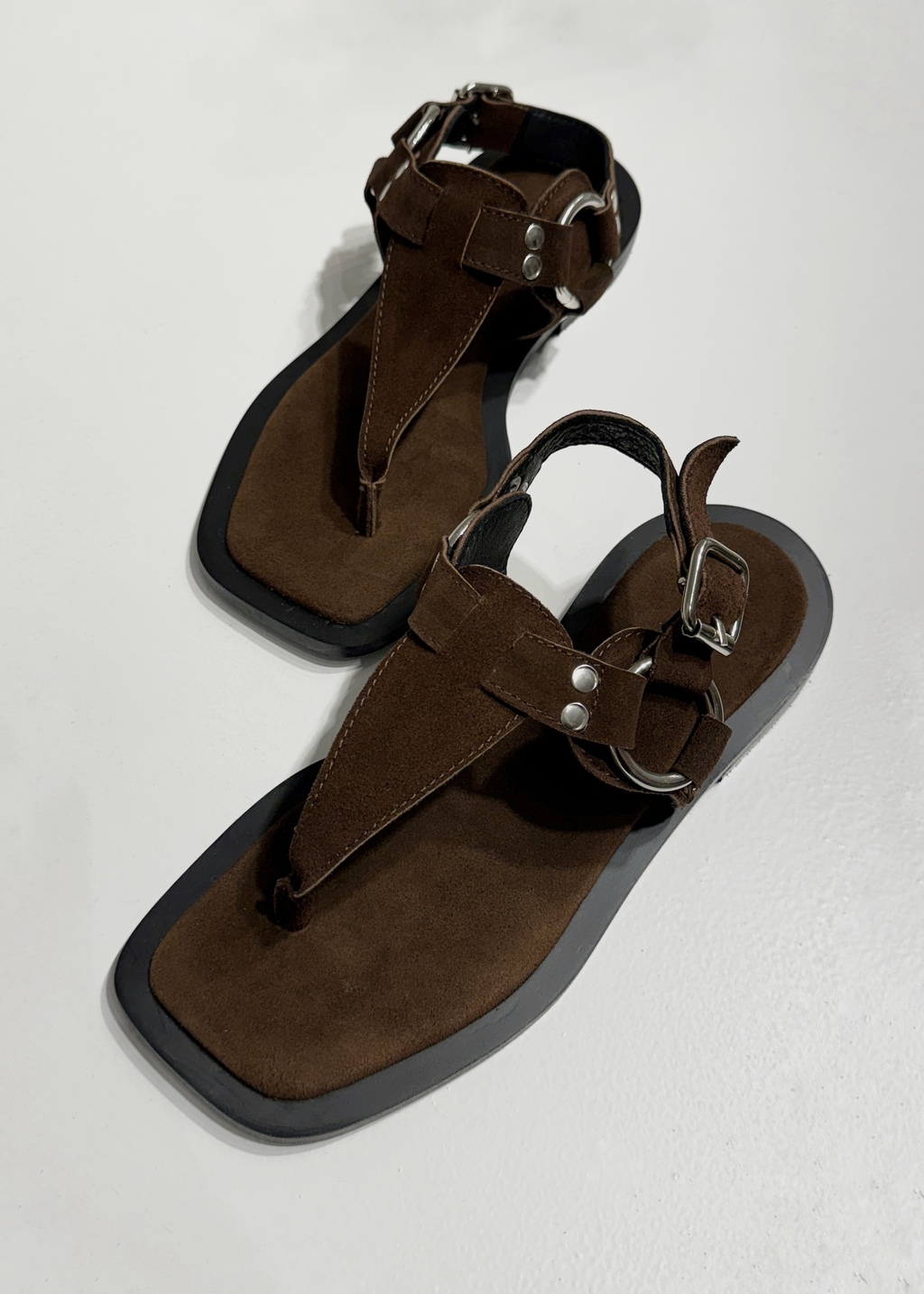Sandalia con tira de agarre. Tiene estribo en ambos pies en la parte del talon. Todos sus herrajes son plata.