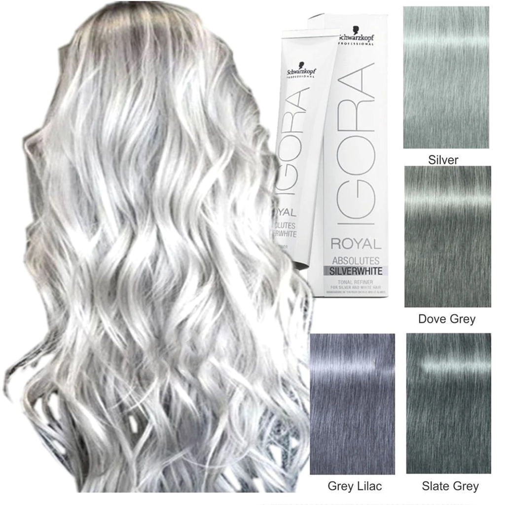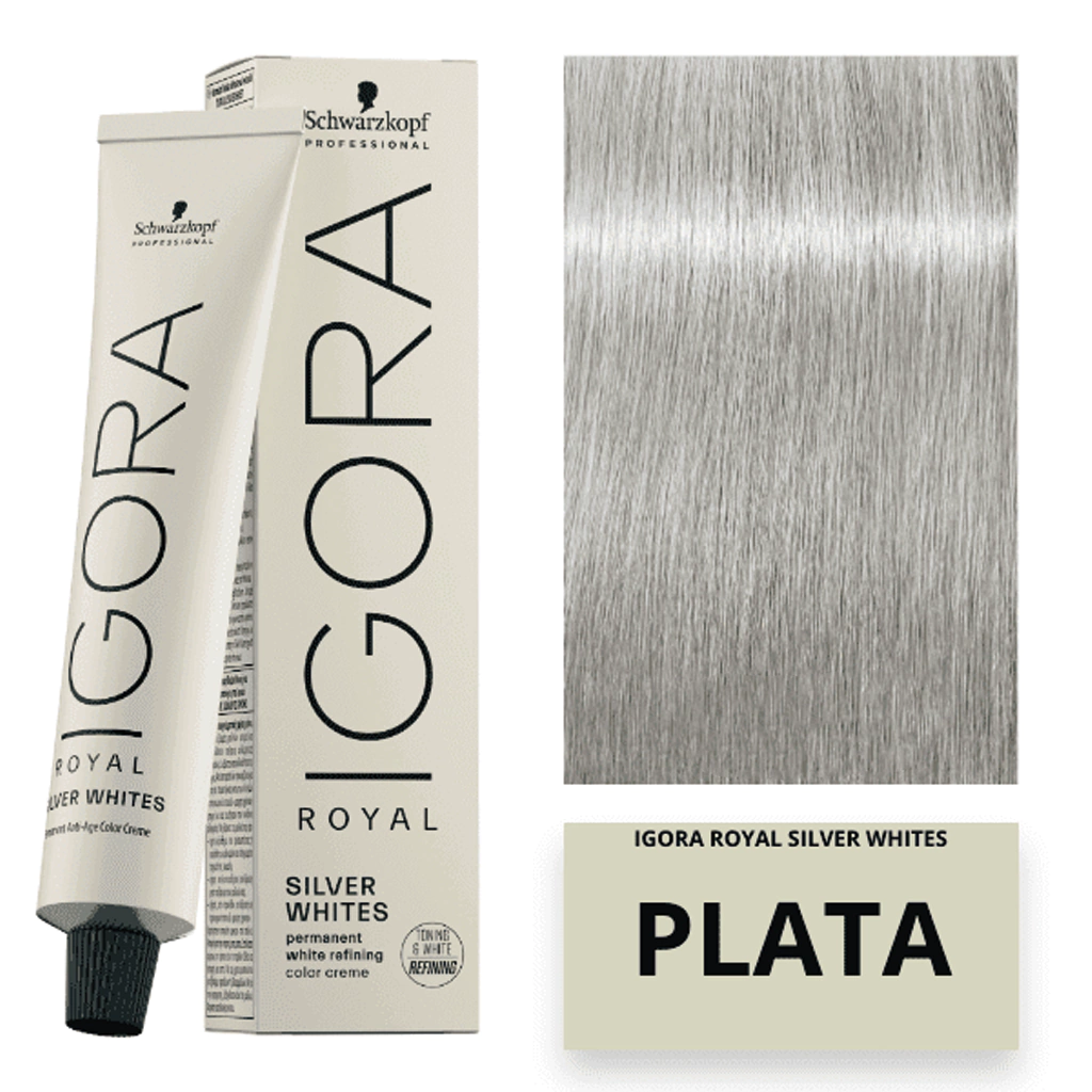 Tintura Igora Royal Silver Whites -SchwarzkopfSÉ ATEMPORAL CON IGORA ROYAL SILVER WHITESPerfecto para aceptar y realzar el cabello canoso4 tonos plata purosPerfecciona y embellece el cabello blanco o gris naturalTonaliza suavemente el cabello gris y blanco