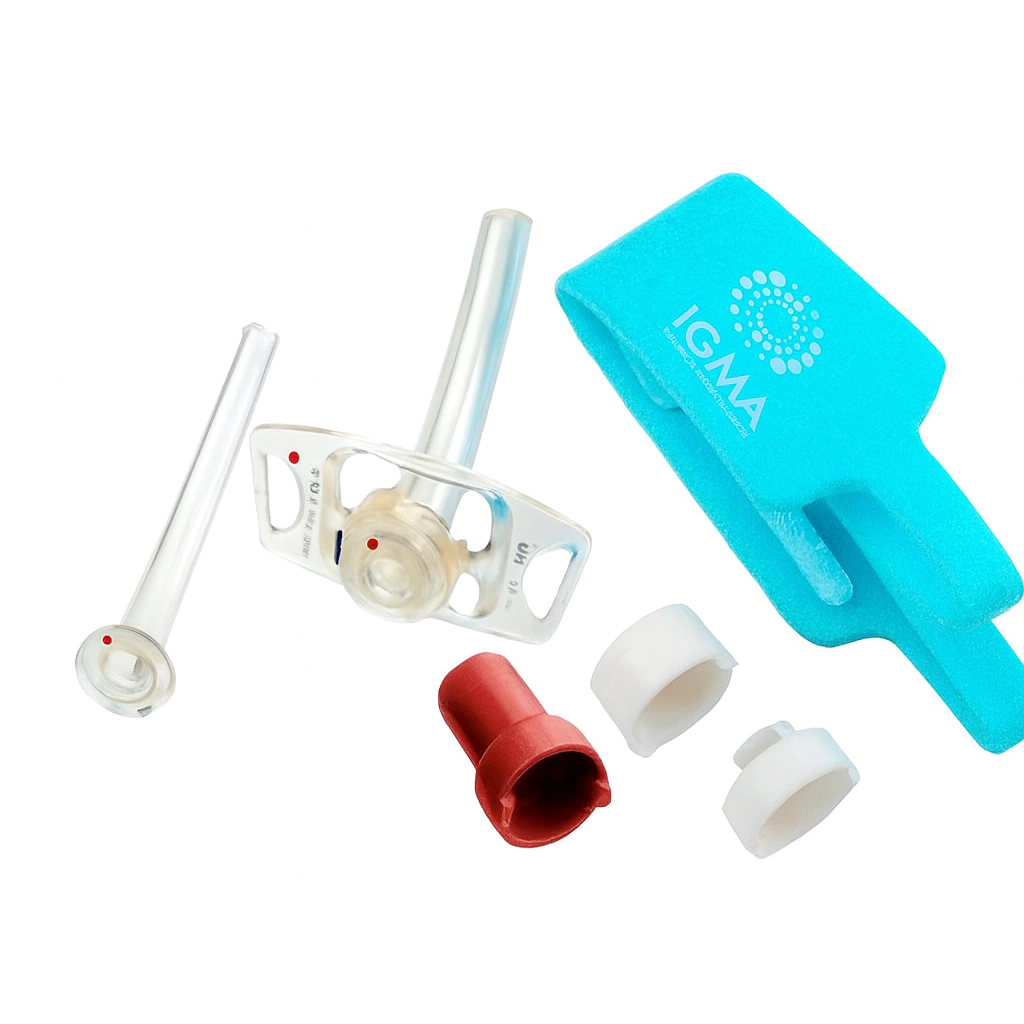 Cánula de traqueostomía tipo Biesalski sin balón de neumotaponamiento.Equipada con endocánula, válvula fonatoria, tapa de baño y conector universal de15 mm.El color de conector varía según el talle