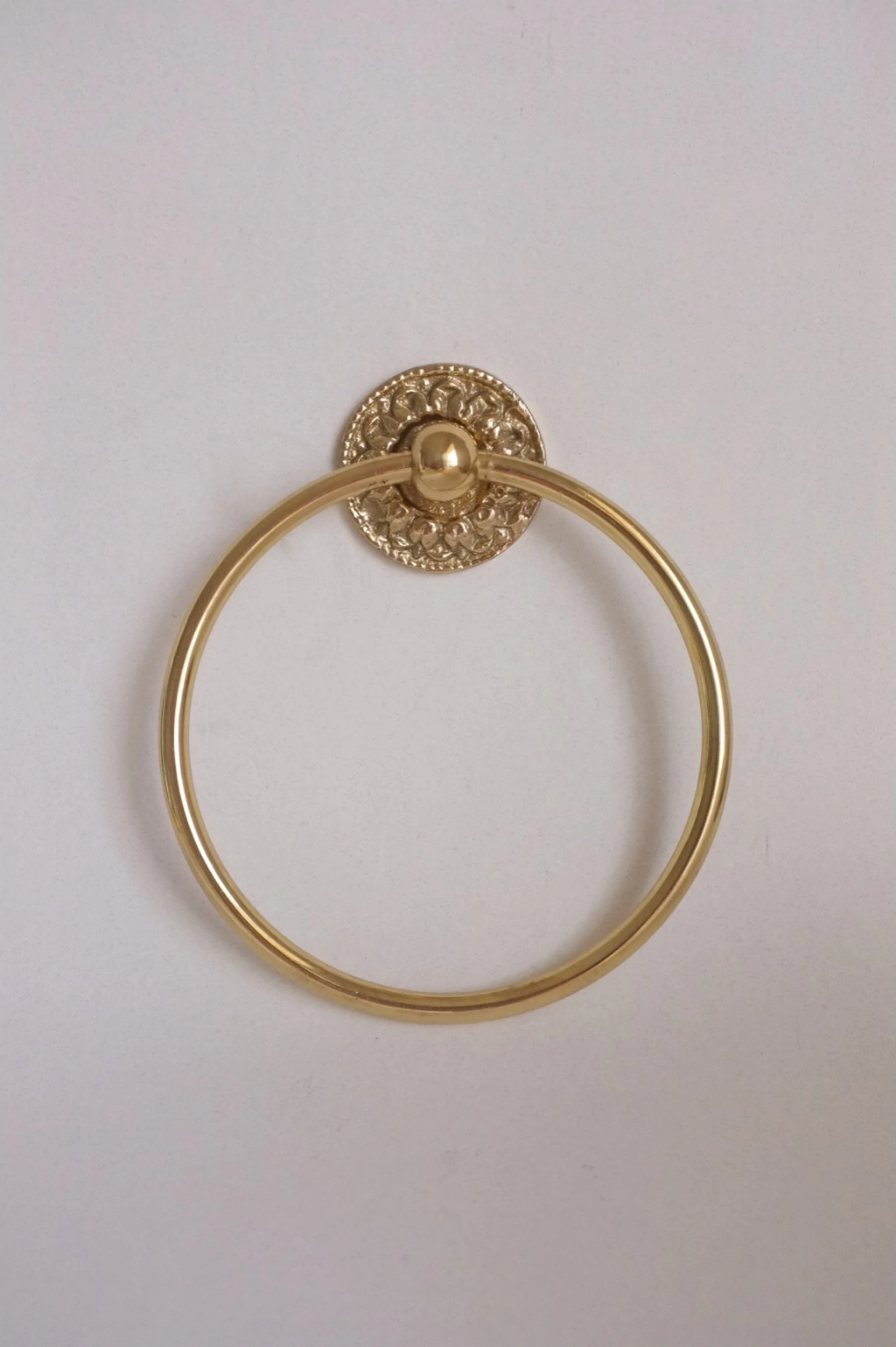 Toallero aro de pared fabricado en bronce pulido con laca.Medidas:Base: 5 cmAlto: 15 cmAncho: 13 cmProfundidad: 3 cm