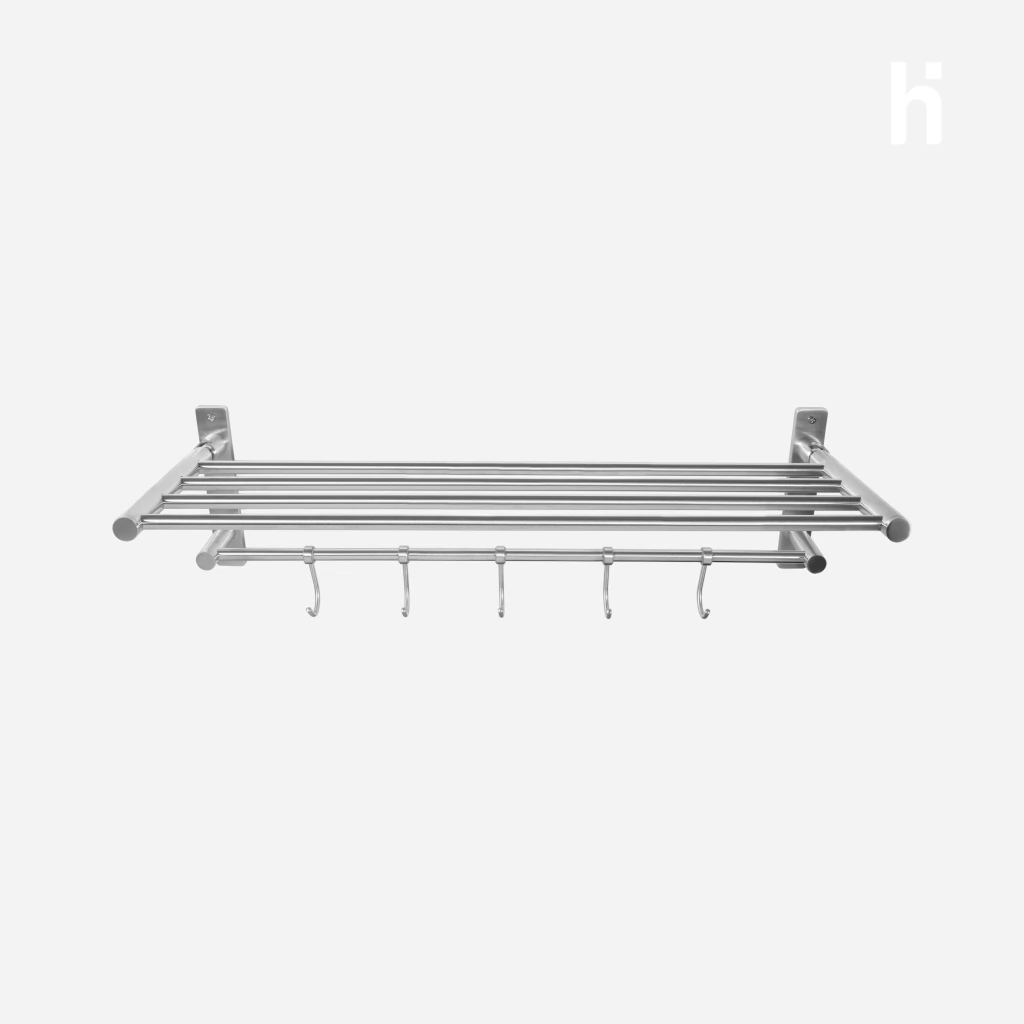 Este estante toallero de pared en acero inoxidable combina funcionalidad y diseño minimalista. Su estructura sólida incluye un estante superior con varillas paralelas ideal para toallas plegadas o artículos de baño, junto con un barral inferior que incorpora cinco ganchos móviles, perfectos para colgar accesorios.Diseñado para maximizar el espacio y mantener todo en orden, este modelo se adapta tanto a baños modernos como clásicos. Los ganchos pueden deslizarse fácilmente según la necesidad, brindando mayor versatilidad. Fabricado en acero inoxidable 304 de alta calidad, es resistente y de fácil limpieza. Se instala de forma firme y segura sobre la pared con tornillos y tarugos incluidos.