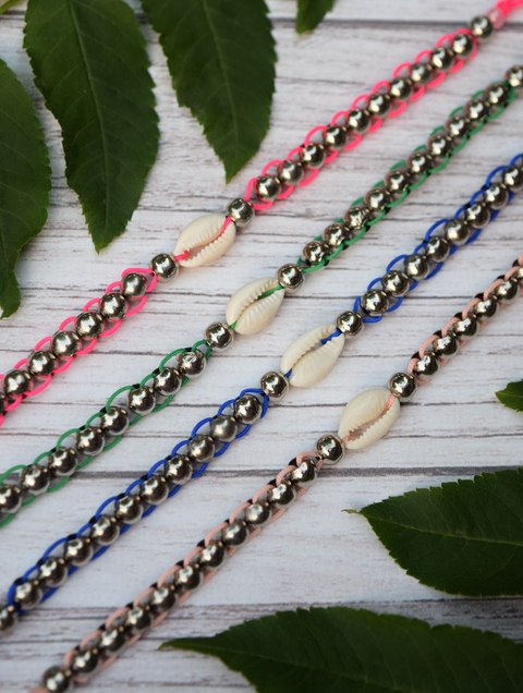 Tobillera + Tarjeta Ilustrativa.Tobillera de cuentas de acero entrelazadas con hilo chino y dije central caracol bucios.