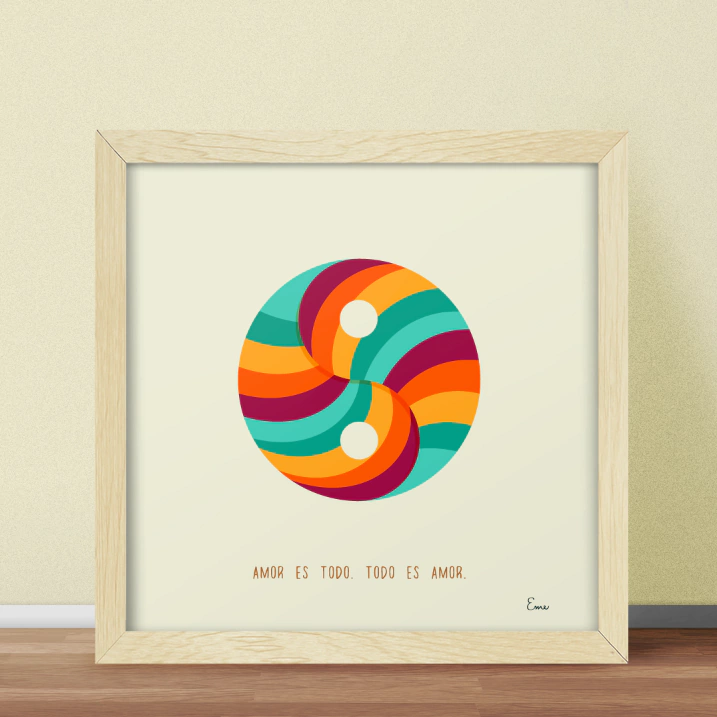 Ilustración "Todo es Amor" de la Serie De los SímbolosLa ilustración está disponible impresa digitalmente en 2 tamaños:- 30x30cm (papel Ilustración de 300gr.)- 50x50cm (papel Fotográfico Lustre de 300gr.)Las opciones enmarcadas incluyen un marco de madera Kiri con varilla chata de 2cm y frente de vidrio. Vienelisto para colgarcon gancho metálico en la parte posterior o alambre reforzado en la medida más grande.(El marco suma 3cm de alto y 3cm de ancho.)La opción "Sin Enmarcar" la encontrás en las variantes de Marco.EnvíosPodés retirar tu cuadro en nuestro taller de Béccar. Hacemos envíos personalmente en zona norte y algunos barrios de CABA. Para otros destinos, el envío es por correo. Las tarifas y zonas se pueden ver completando tu código postal en el calculador de envío.Cualquier duda que tengas al respecto, no dudes en escribirnos a[email protected]Los colores de las imágenes pueden variar según la configuración de la pantalla.Chequeá la categoría Combinados para ver cómo se ven las distintas ilustraciones de la Serie De los Símbolos juntas!Punto Eme utiliza productos artesanales de primera calidad hechos en Argentina.Todas las imágenes presentes en este sitio pertenecen a Mercedes Alvarez.Está prohibida toda utilización o reproducción de estas imágenes sin autorización escrita.