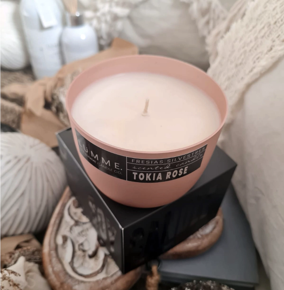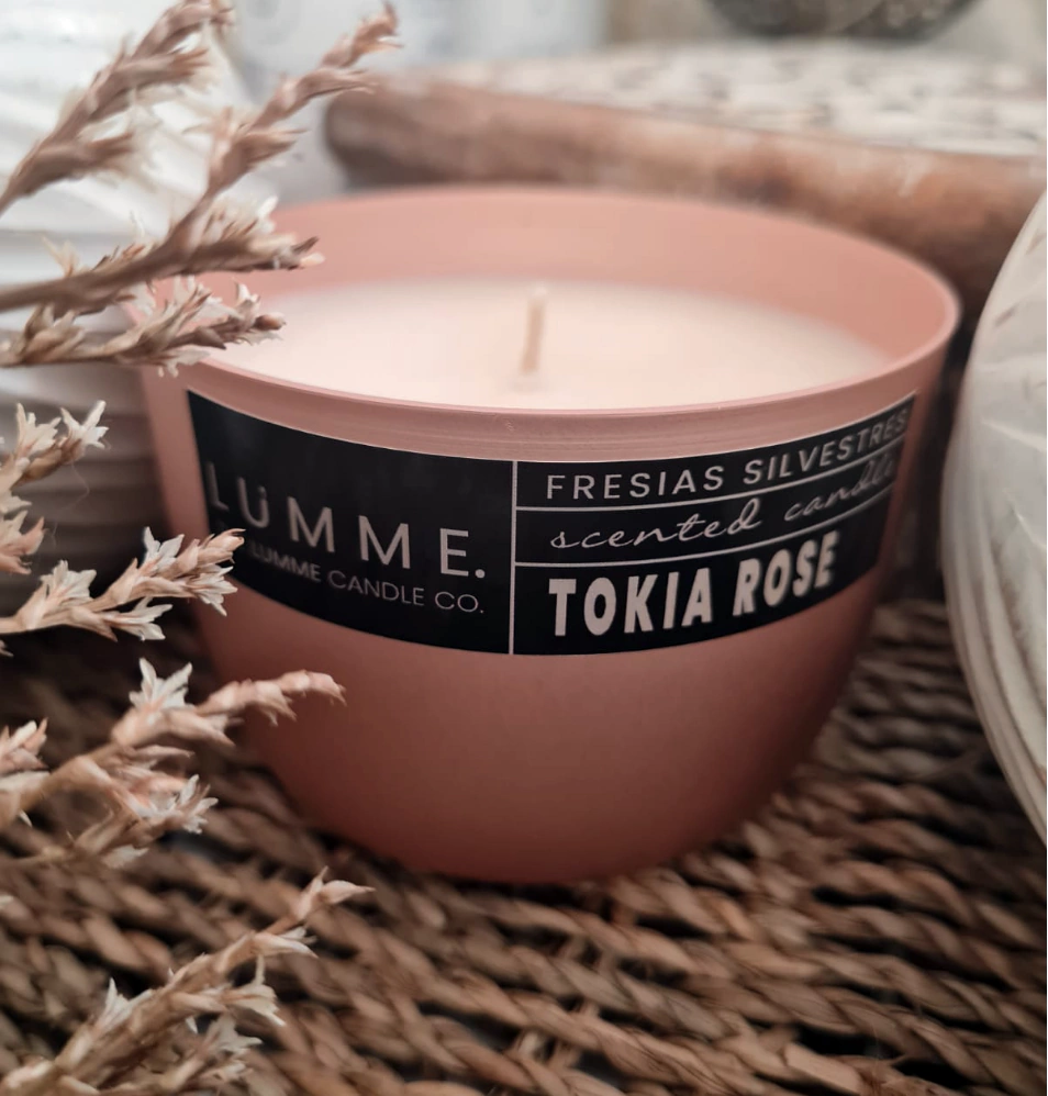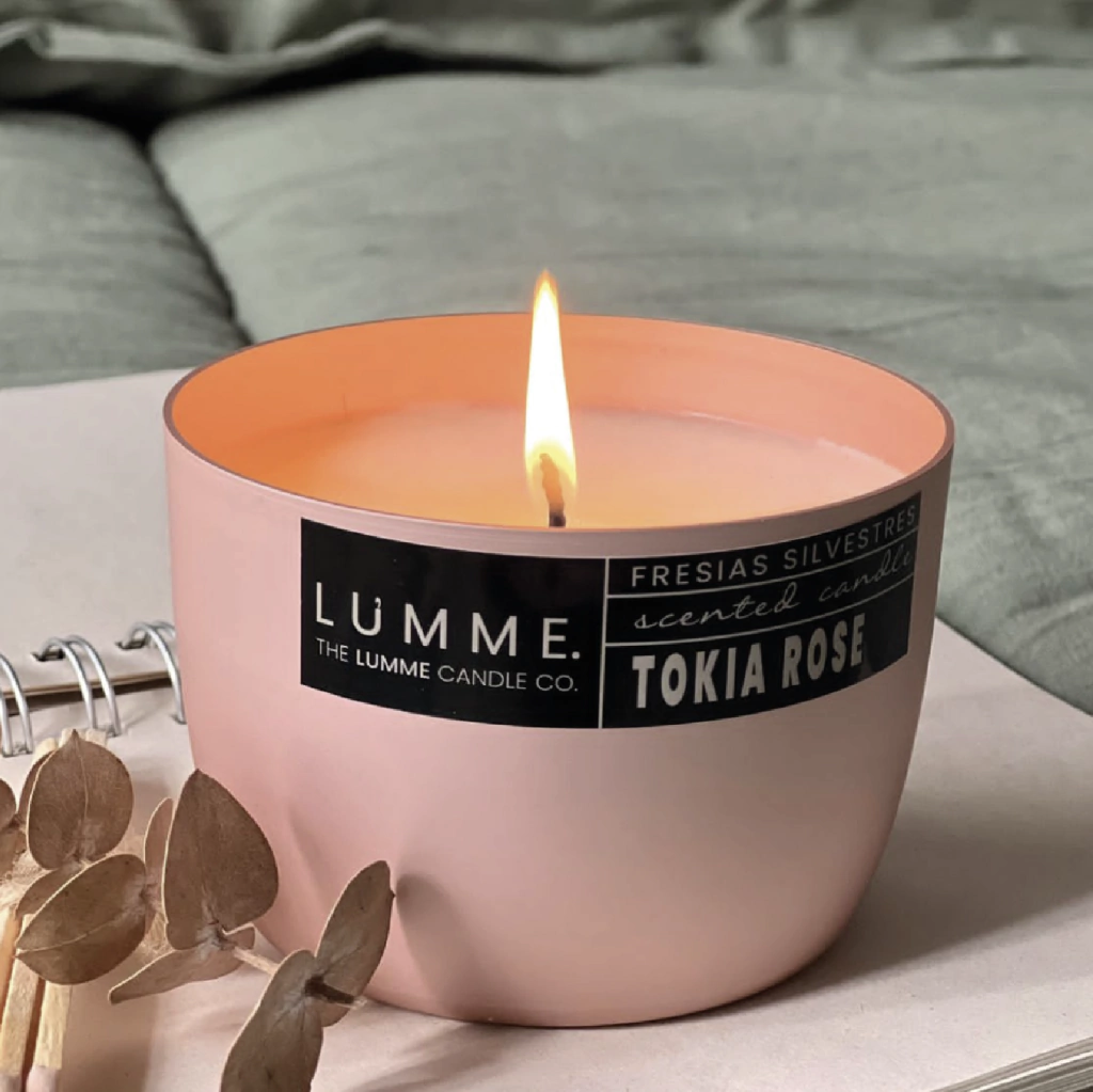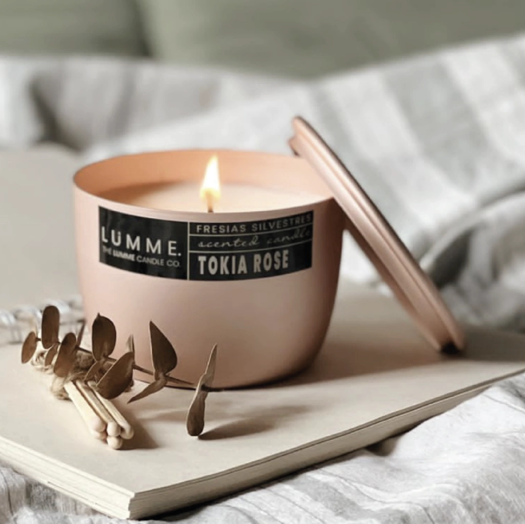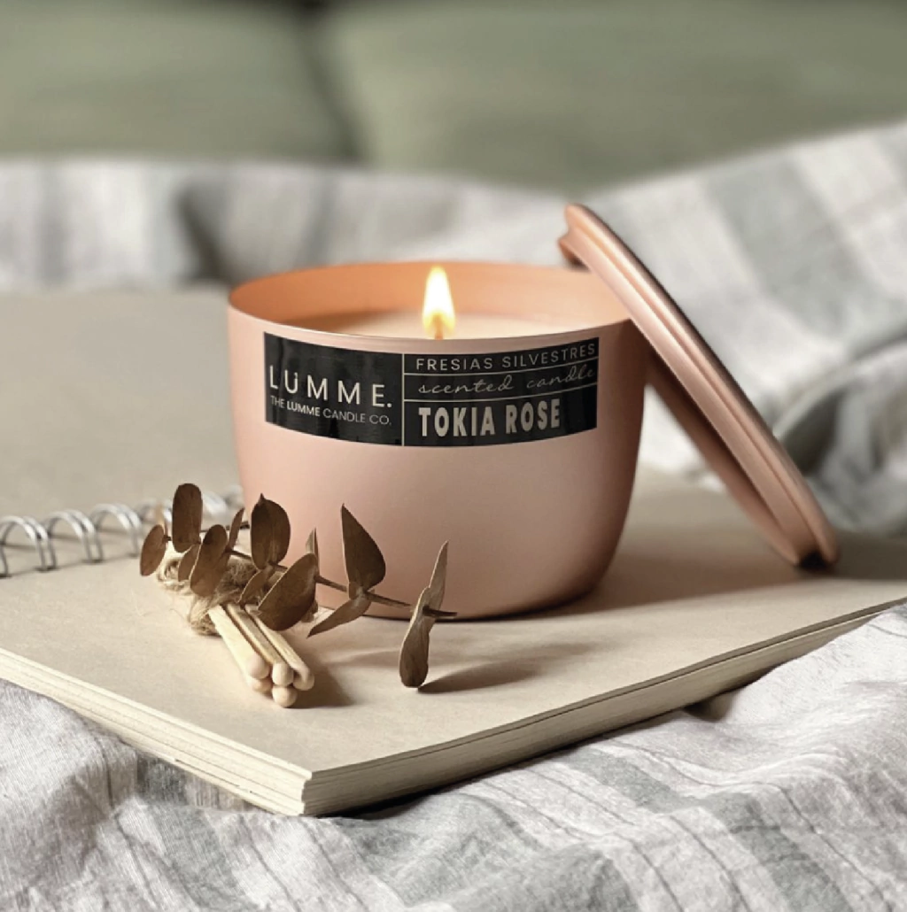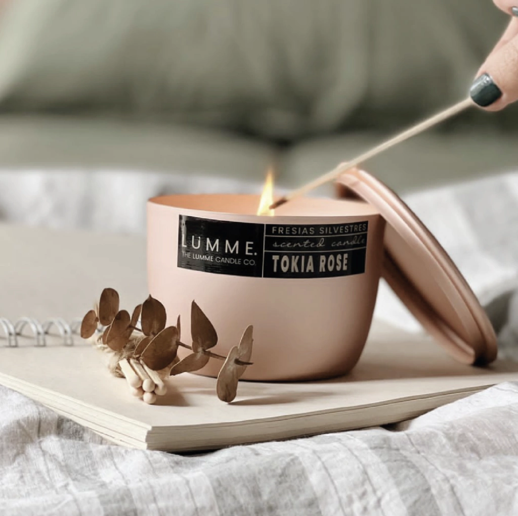 En un envase metálico arenado opaco, en Color Oro Rosa, con fragancia de esencia natural Flesias Silvestres