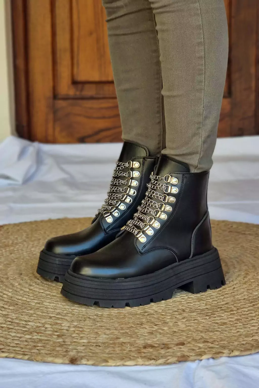 Borcegos de ecocuero color negro con detalle de cadenas.Taco: 6,5 cm.Plataforma: 3,5 cm.Horma: Normal.