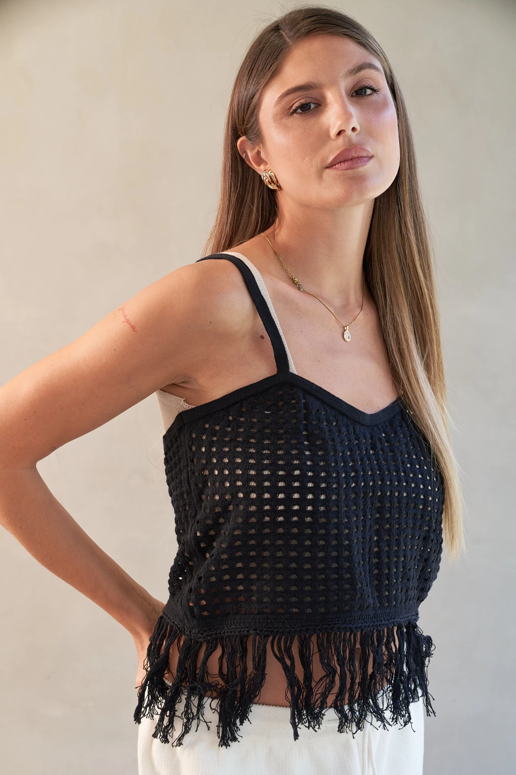 Crop top tejido en algodon 100%. trama de punto abierto, con flecos y corte rectangular.