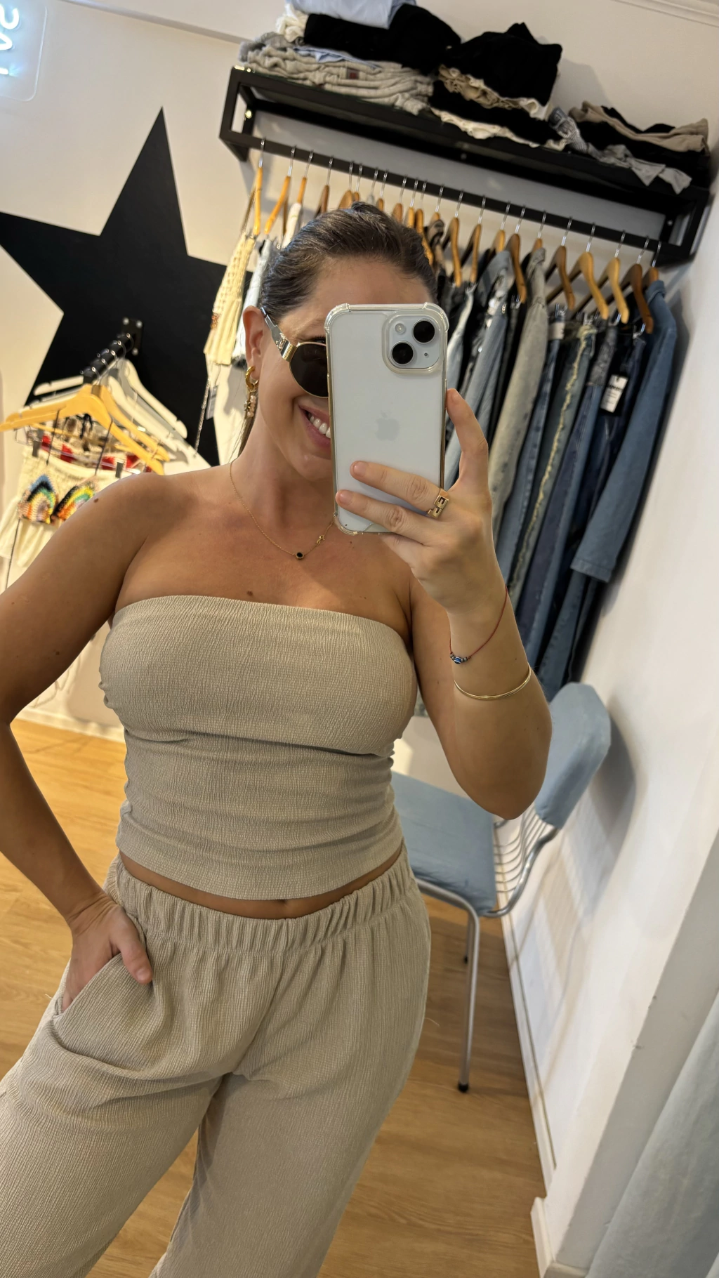 Top strapples de tela tipo creo color visón con frunces en los costadostalle único