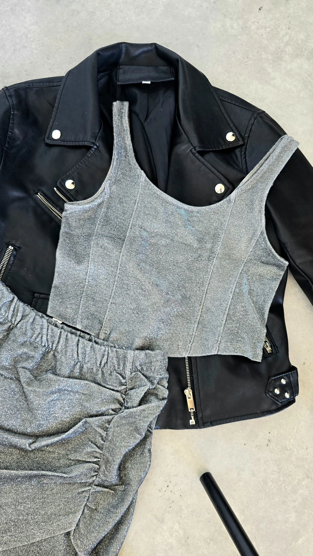 Top de punto roma con brillos plateados, sin mangas, escote redondo bajo.