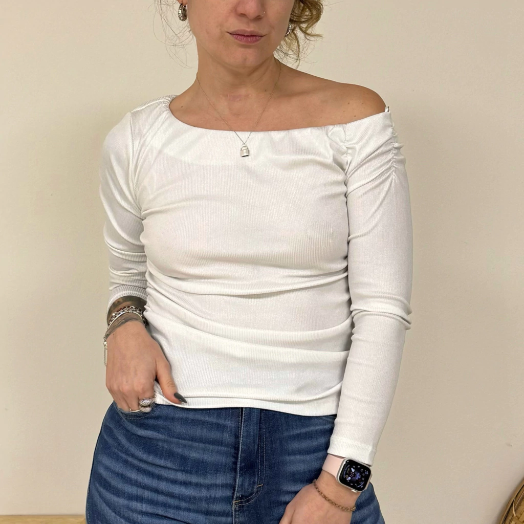 top de morley, un hombro caido, varios frunces. elastizada foilMEDIDAS DE LA PRENDATalleAncho de bustoLargoS39 cm49 cmM41 cm50 cmL43 cm51 cmLas medidas estan tomadas sobre la prenda en plano, la tela es elastizadaComposición: 96% Polyester 4% elastano